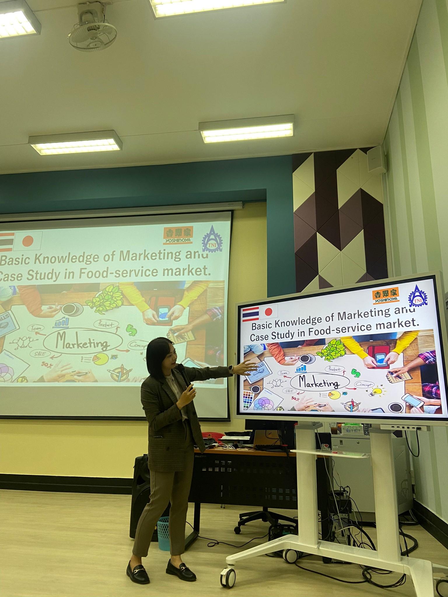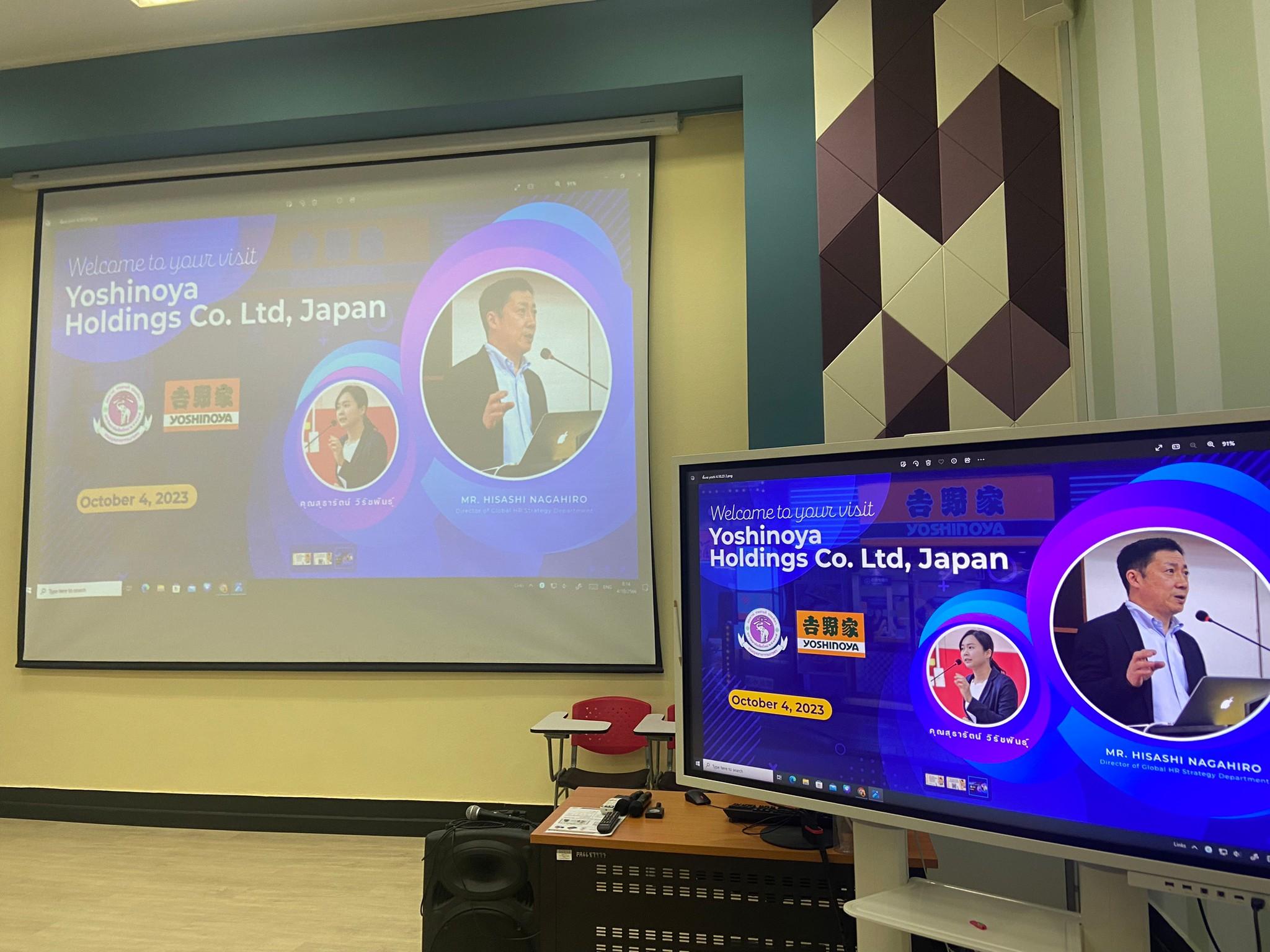 เมื่อวันที่ 4 ตุลาคม 2566 ผู้ช่วยศาสตราจารย์ ดร.สุทัศน์ สุระวัง รองคณบดีฝ่ายวิชาการ ให้การต้อนรับ Mr. Nagahiro Hisashi, General manager Ms. Sutharat Wirachapan, Recruitment manager จากบริษัท Yoshinoya Holdings Co., Ltd. พร้อมเข้าจัดบรรยายให้กับนักศึกษาในหัวข้อ “Marketing in Food-service Business” ณ ห้อง 1-111 อาคาร 1 เวลา 09.00-12.00 น. เป็นการอบรมให้ความรู้แก่นักศึกษาที่มีความสนใจศึกษาหรือต้องการทำงาน ณ ประเทศญุ่ปุ่น นอกจากนี้ยังให้ความรู้เกี่ยวกับอุตสาหกรรมอาหารญี่ปุ่นเพื่อนำองค์ความรู้มาประยุกต์ใช้ในอนาคต ทางคณะอุตสาหกรรมเกษตรขอขอบพระคุณ Mr. Nagahiro Hisashi, General manager Ms. Sutharat Wirachapan, Recruitment manager จากบริษัท Yoshinoya Holdings Co. เป็นอย่างสูง