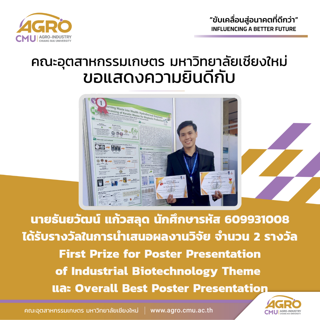 เมื่อวันที่ 26-29 พฤศจิกายน 2566 นายธันยวัฒน์ แก้วสลุด นักศึกษารหัส 609931008 ได้รับรางวัลในการนำเสนอผลงานวิจัย จำนวน 2 รางวัล ได้แก่ 1) First Prize for Poster Presentation of Industrial Biotechnology Theme และ 2) Overall Best Poster Presentation เรื่อง “Turning Waste into Wealth: Hydrothermal-Enzymatic Processing of Keratin Wastes for Bioplastic Production” ในงานประชุมวิชาการ The 35th Annual Meeting of the Thai Society for Biotechnology and International Conference (TSB 2023) “Sustainable Development through Bio-Circular Green (BCG) Economy Model” ณ โรงแรม The Greenery Resort - Khao Yai จังหวัดนครราชสีมา ประเทศไทย โดยมีรองศาสตราจารย์ ดร.ทนงศักดิ์ ไชยาโส เป็นอาจารย์ที่ปรึกษา และอาจารย์ ดร.กมล ยากูล เป็นผู้ร่วมวิจัย