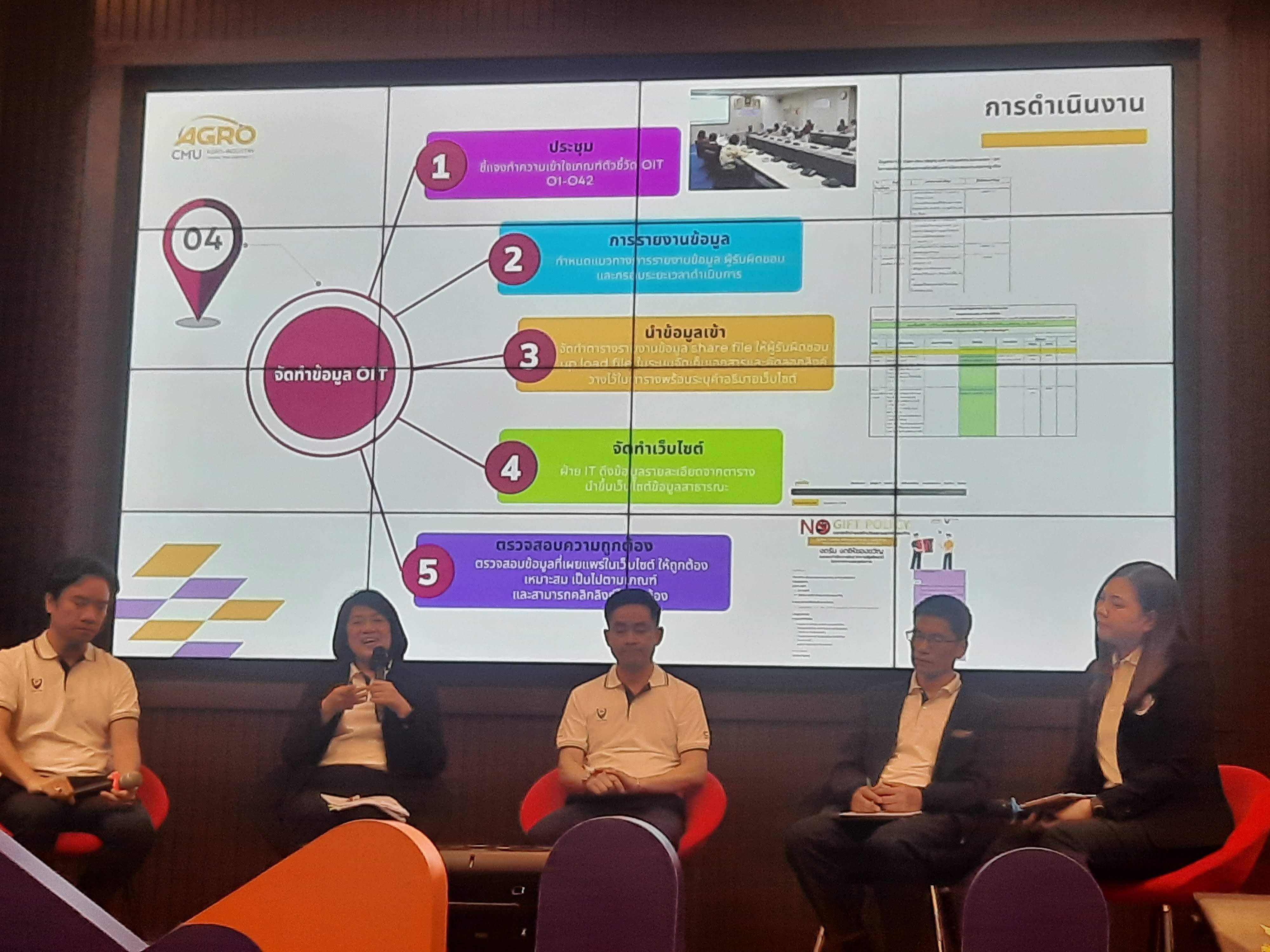 วันที่ 5 มกราคม 2567 ผู้ช่วยศาสตราจารย์ ดร.ศรีสุวรรณ นฤนาทวงศ์สกุล รองคณบดีคณะอุตสาหกรรมเกษตร ได้เข้าร่วมการแลกเปลี่ยนเรียนรู้ประสบการณ์การดำเนินงานที่ดี (Good Practice) ของหน่วยงานที่มีผลการประเมิน ITA ที่โดดเด่น ร่วมกับอีก 2 หน่วยงาน ได้แก่ สภามหาวิทยาลัย และสำนักบริการวิชาการ ในการประชุมชี้แจงโครงการประเมินการเปิดเผยข้อมูลสาธารณะของส่วนงาน มหาวิทยาลัยเชียงใหม่ (CMU-OIT) ประจำปีงบประมาณ พ.ศ. 2567 โดยมี ศาสตราจารย์ ดร.นพ.พงษ์รักษ์ ศรีบัณฑิตมงคล อธิการบดีมหาวิทยาลัยเชียงใหม่ เป็นประธานพิธีเปิดการประชุม โดยมีวัตถุประสงค์เพื่อชี้แจงการปรับโครงการ CMU-ITA เป็น CMU-OIT ที่ช่วยลดความซ้ำซ้อนระหว่างการประเมิน ITA ของสำนักงาน ป.ป.ช. กับการประเมิน CMU-ITA ของมหาวิทยาลัยเชียงใหม่ เพื่อมุ่งเน้นให้บุคลากร นักศึกษา ผู้รับบริการและผู้มีส่วนได้ส่วนเสียภายนอก ได้รับทราบถึงผลการดำเนินงานของส่วนงาน สร้างกระบวนการมีส่วนร่วมในการตรวจสอบ และร่วมกันยกระดับคุณธรรมและความโปร่งใสของมหาวิทยาลัยเชียงใหม่ ให้บรรลุเป้าหมายการเป็นมหาวิทยาลัยใสสะอาด ปราศจากการทุจริต ซึ่งมีส่วนงานที่เข้าร่วมรับการประชุม CMU-OIT ทั้งหมด 46 ส่วนงาน ผ่านระบบ Onsite และ Online ณ ห้องประชุม 201 ชั้น 2 สำนักบริการเทคโนโลยีสารสนเทศ