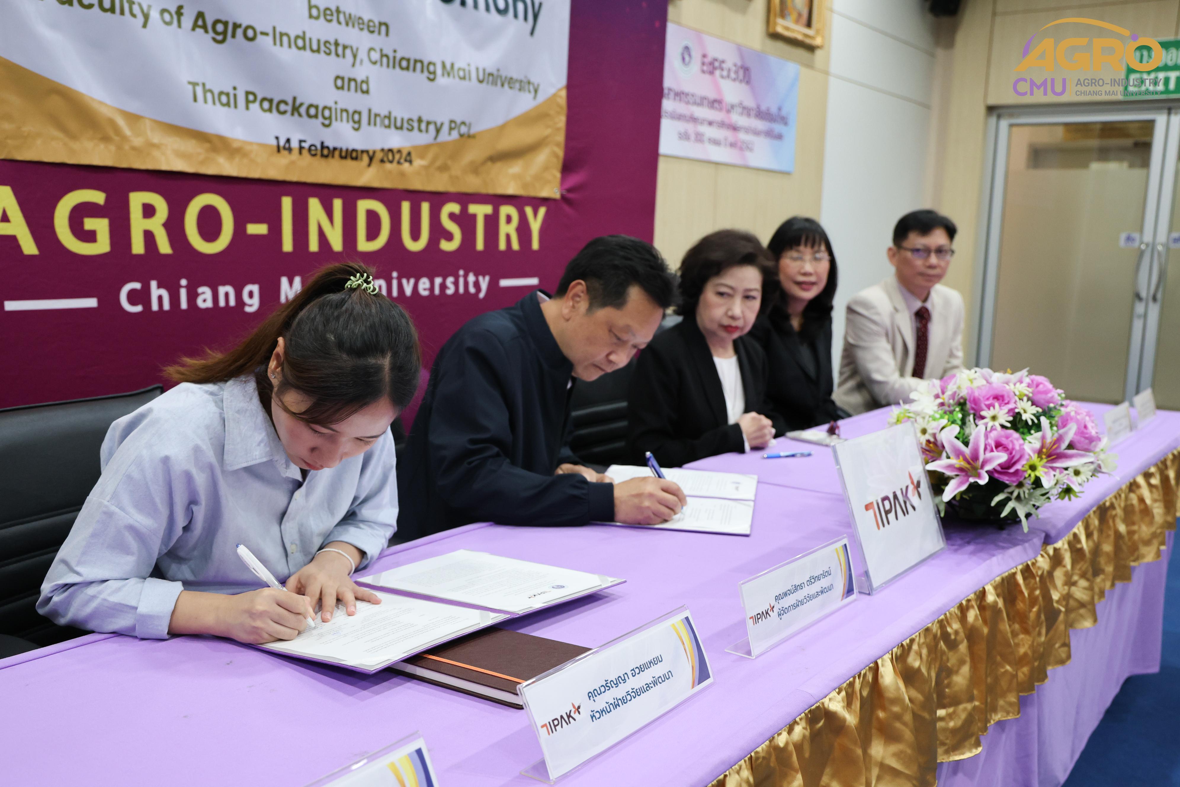 วันที่ 14 กุมภาพันธ์ 2567 คณะอุตสาหกรรมเกษตร มหาวิทยาลัยเชียงใหม่ และ บริษัท อุตสาหกรรมไทยบรรจุภัณฑ์ จำกัด มหาชน จัดพิธีลงนามบันทึกข้อตกลงความร่วมมือ (MOU) โดยมีผู้ช่วยศาสตราจารย์ ดร.สุจินดา ศรีวัฒนะ คณบดีคณะอุตสาหกรรมเกษตร และคุณพจน์สิทธา ตรีวิทยารัตน์ ผู้จัดการฝ่ายวิจัยเเละพัฒนา บริษัท อุตสาหกรรมไทยบรรจุภัณฑ์ จำกัด (มหาชน) ร่วมลงนามฯ ซึ่งบันทึกข้อตกลงความร่วมมือดังกล่าวมีขึ้นเพื่อวัตถุประสงค์การดำเนินงานด้านงานวิจัยและกิจกรรมนักศึกษาระหว่างคณะอุตสาหกรรมเกษตรและ บริษัท อุตสาหกรรมไทยบรรจุภัณฑ์ จำกัด (มหาชน) โดยในโอกาสนี้มี รองศาสตราจารย์ ดร. พิชญา พูลลาภ รองคณบดีฝ่ายวิจัย ผู้ช่วยศาสตราจารย์ ดร. สรญา เขียวนาวาวงศ์ษา ผู้ช่วยคณบดี และ ศ. ดร. พรชัย ราชตนพันธุ์ หัวหน้าสาขาวิชาเทคโนโลยีการบรรจุ พร้อมทั้ง คุณวรัญญา ฮวยแหยม หัวหน้าฝ่ายวิจัยและพัฒนา และ คุณหัตถชัย วิชาโคตร เจ้าหน้าที่ฝ่ายวิจัยและพัฒนา เข้าร่วมพิธีลงนามฯ ดังกล่าว ณ ห้องประชุม 3 อาคารสำนักงานคณะอุตสาหกรรมเกษตร