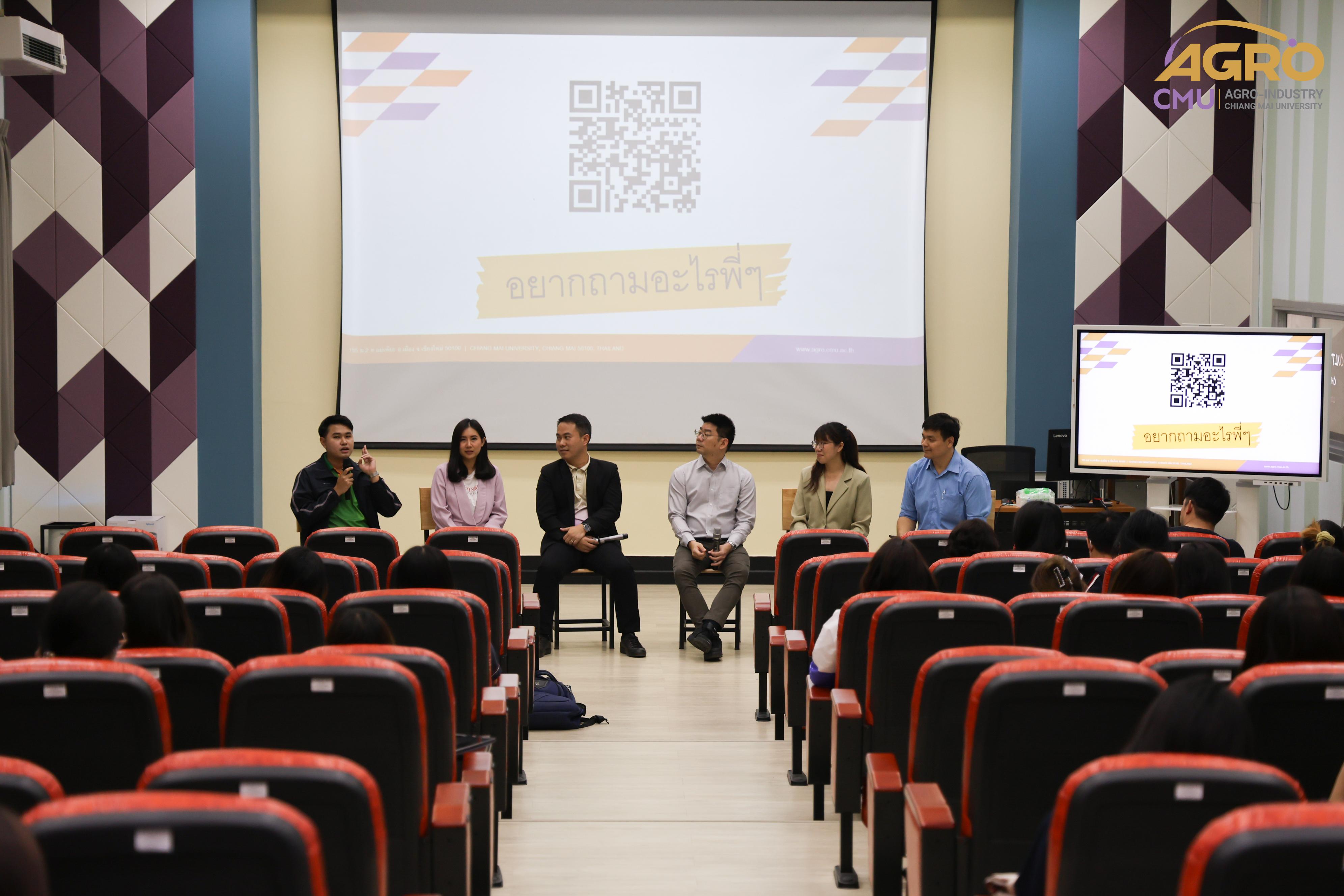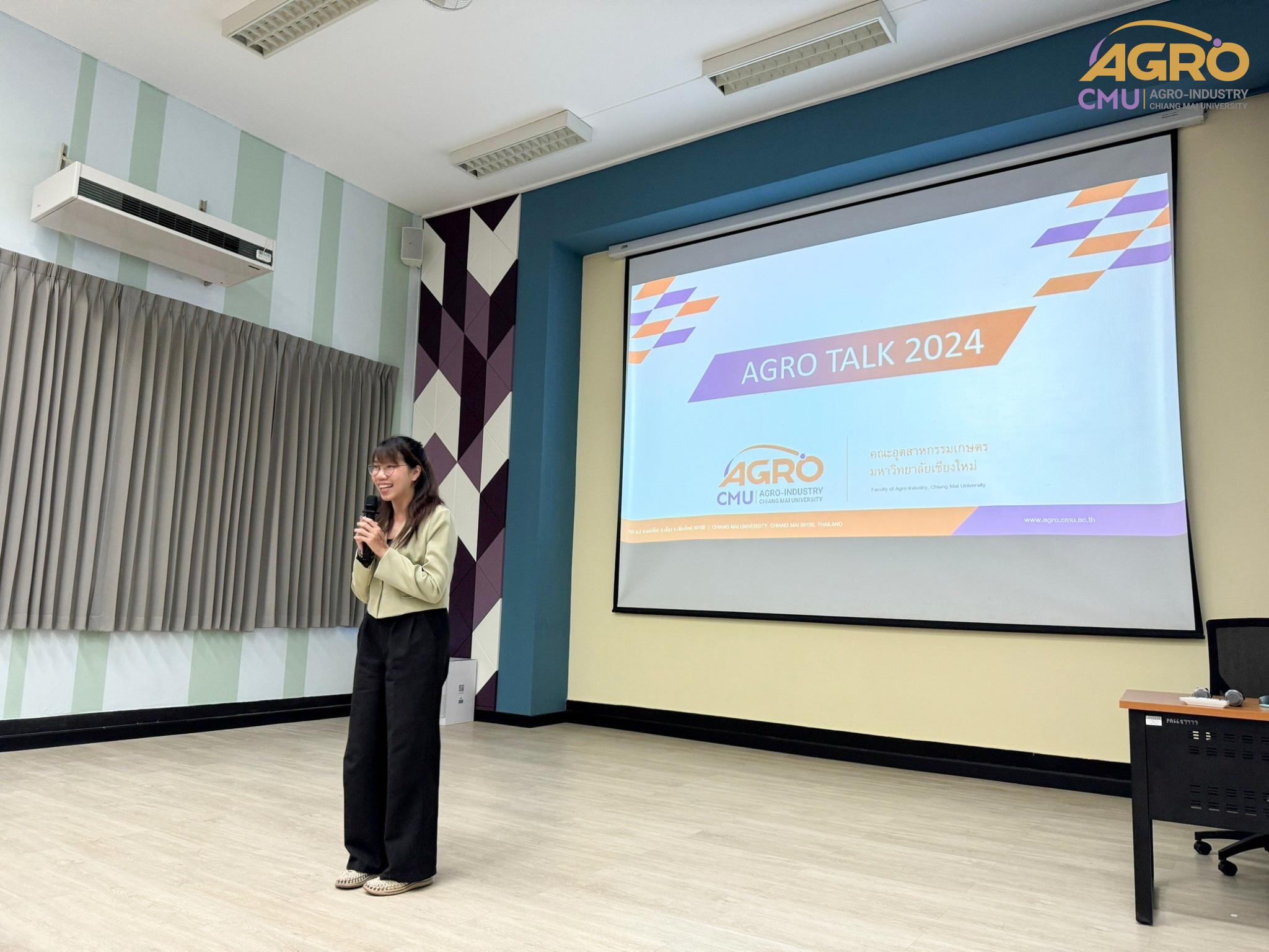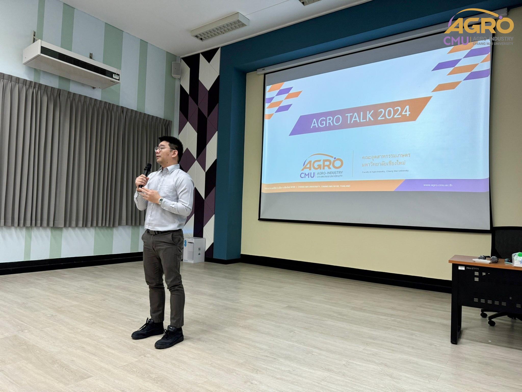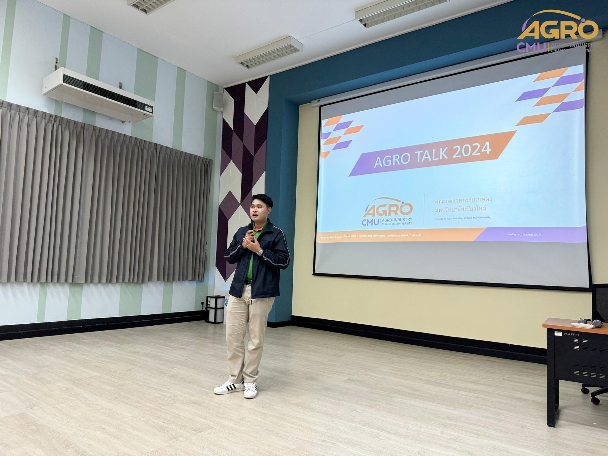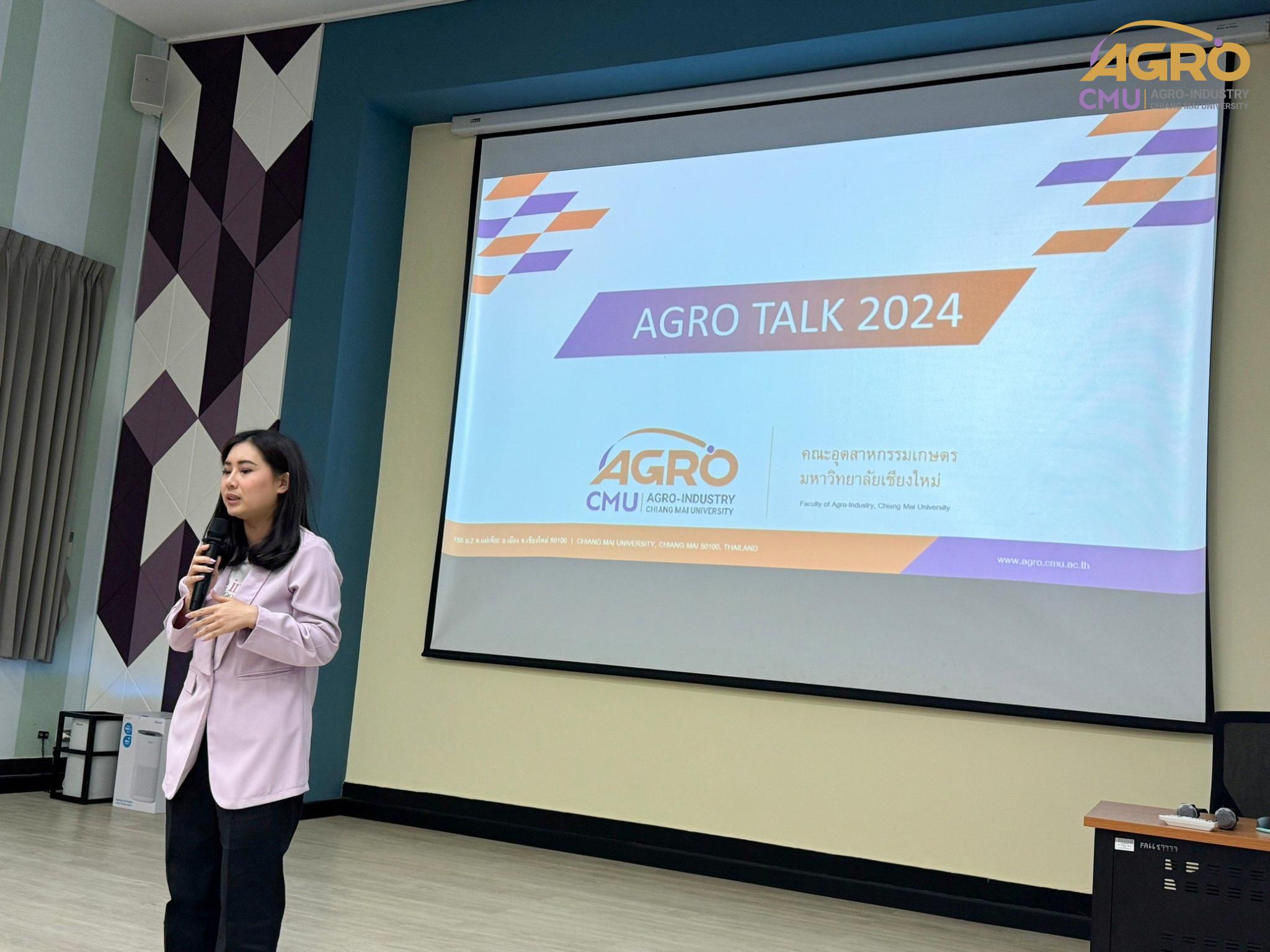 เมื่อวันที่ 19 กุมภาพันธ์ 2567 ที่ผ่านมา สำนักวิชาอุตสาหกรรมเกษตร ได้จัดกิจกรรม “AGRO TALK 2024” เพื่อให้นักศึกษาได้เห็นถึงแนวทางการประกอบอาชีพในอนาคต การเตรียมความพร้อมก่อนเข้าสู่วิชาชีพ และเสริมสร้างความสัมพันธ์อันดีระหว่าง ศิษย์ปัจจุบัน ศิษย์เก่า และบุคลากรของคณะฯ โดยในกิจกรรมนี้ได้รับเกียรติจากรุ่นพี่ศิษย์เก่าหลากหลายสาขาอาชีพในการเป็นวิทยากรและเข้าร่วมการเสวนา จำนวน 5 ท่าน ได้แก่ 1) พี่ต้น (เฉลิมพล ใหม่คำ) ผู้จัดการโรงงานแปรรูปเนื้อไก่ ลำปาง บริษัท ซีพีเอฟ (ประเทศไทย) จำกัด (มหาชน) 2) พี่โต้ (ยุทธพงษ์ เรืองสิริ) รองกรรมการผู้จัดการบริษัท เชียงใหม่ เฮลตี้ โปรดักส์ จำกัด 3) พี่แนน (เบญญาภา ภิญโญฤทธิ์) Medical Representative (บริษัท ลอรีอัล ประเทศไทย จำกัด) 4) พี่เฟิร์น (ธันย์ชนก ยอเสน) นักวิทยาศาสตร์ ห้องปฏิบัติการกลาง คณะเกษตรศาสตร์ มหาวิทยาลัยเชียงใหม่ และ 5) พี่โดนัท (ณัชพล อยู่เย็น) นักวิชาการส่งเสริมการเกษตรปฏิบัติการ สำนักงานเกษตรจังหวัดเชียงใหม่
