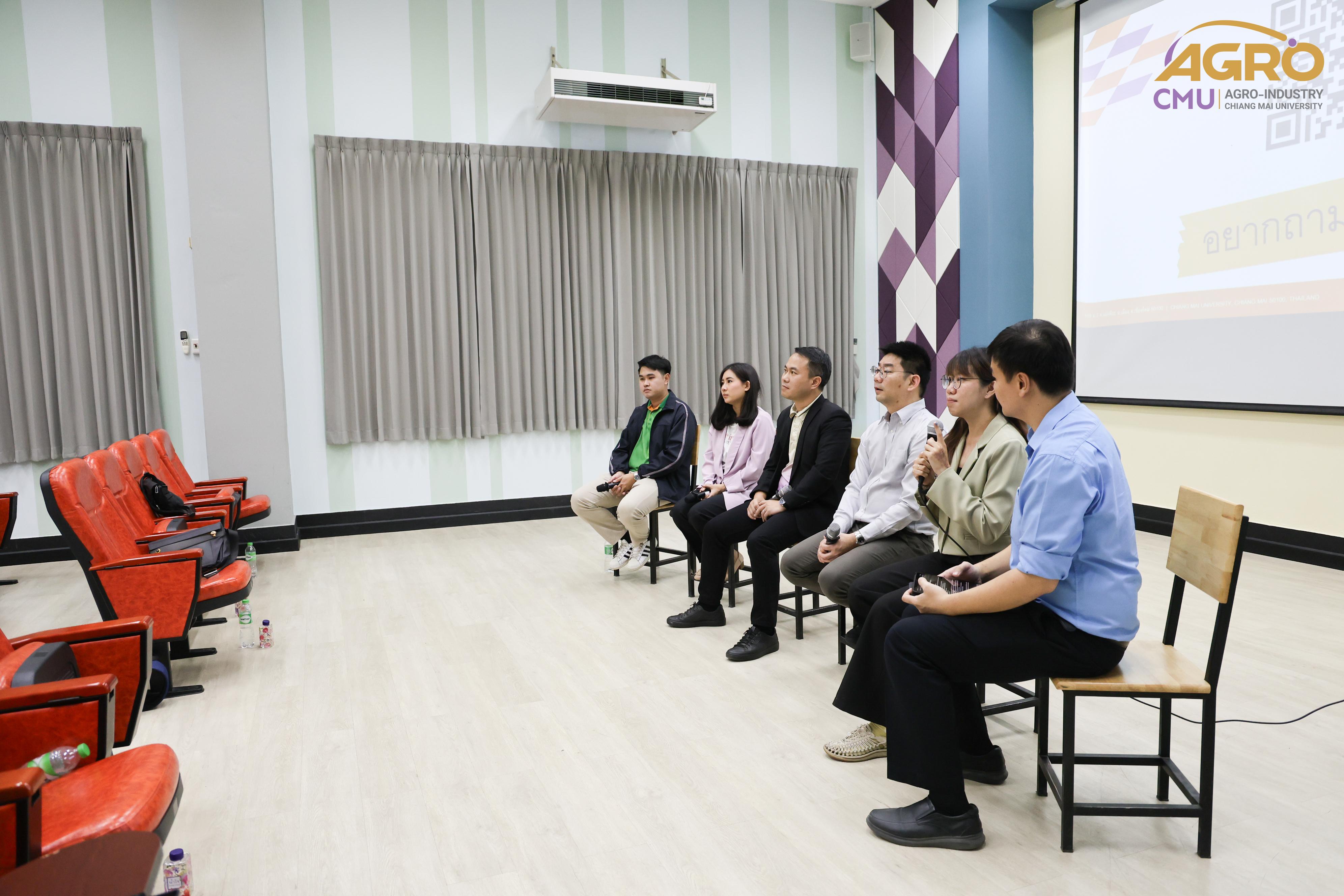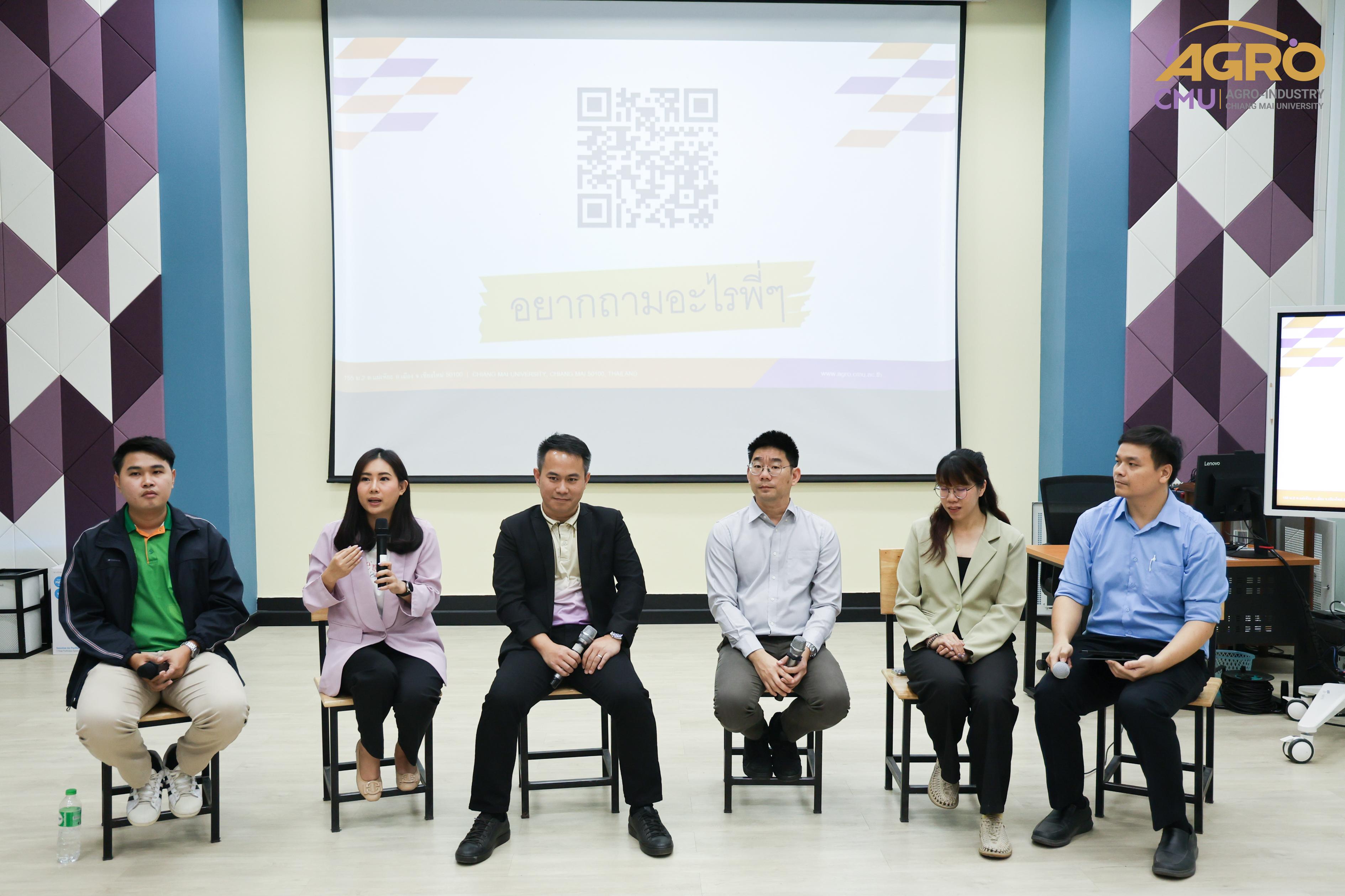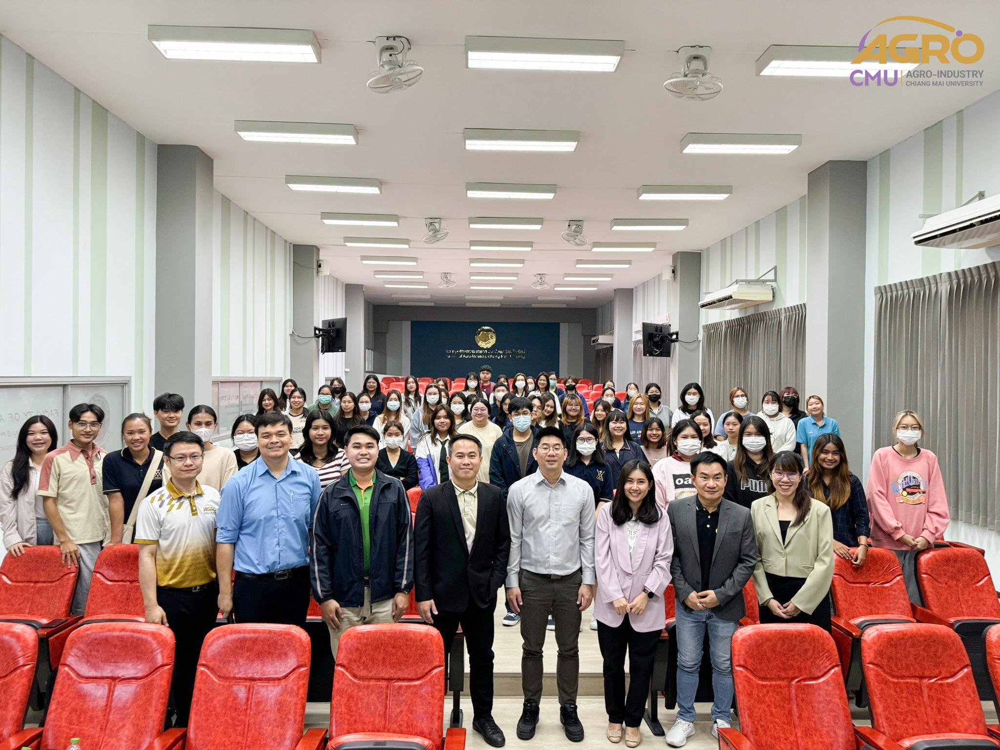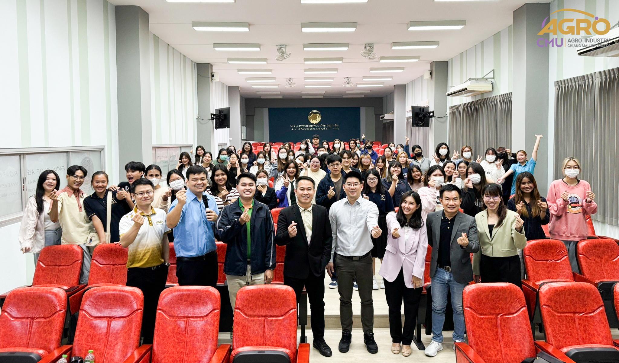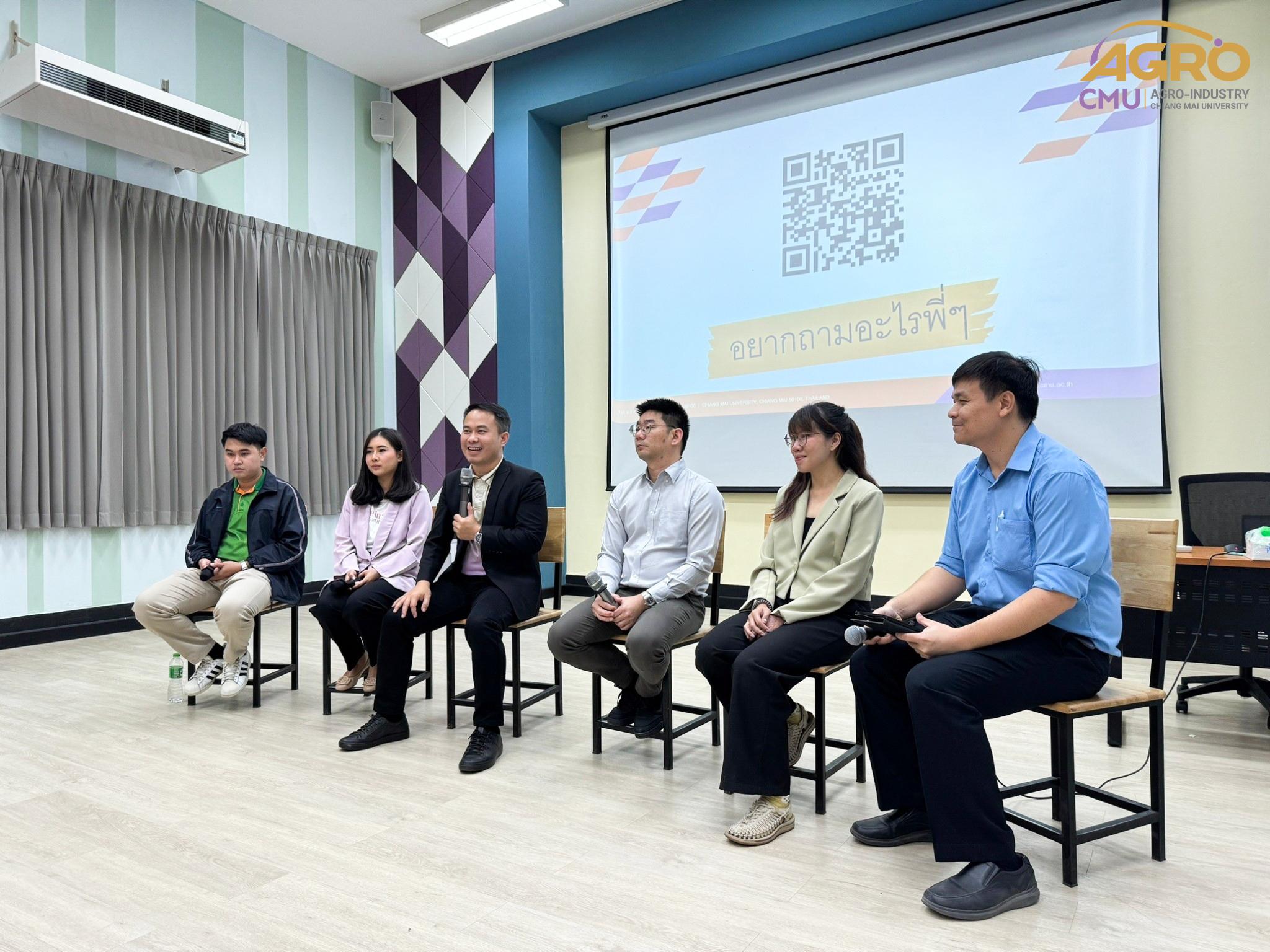 เมื่อวันที่ 19 กุมภาพันธ์ 2567 ที่ผ่านมา สำนักวิชาอุตสาหกรรมเกษตร ได้จัดกิจกรรม “AGRO TALK 2024” เพื่อให้นักศึกษาได้เห็นถึงแนวทางการประกอบอาชีพในอนาคต การเตรียมความพร้อมก่อนเข้าสู่วิชาชีพ และเสริมสร้างความสัมพันธ์อันดีระหว่าง ศิษย์ปัจจุบัน ศิษย์เก่า และบุคลากรของคณะฯ โดยในกิจกรรมนี้ได้รับเกียรติจากรุ่นพี่ศิษย์เก่าหลากหลายสาขาอาชีพในการเป็นวิทยากรและเข้าร่วมการเสวนา จำนวน 5 ท่าน ได้แก่ 1) พี่ต้น (เฉลิมพล ใหม่คำ) ผู้จัดการโรงงานแปรรูปเนื้อไก่ ลำปาง บริษัท ซีพีเอฟ (ประเทศไทย) จำกัด (มหาชน) 2) พี่โต้ (ยุทธพงษ์ เรืองสิริ) รองกรรมการผู้จัดการบริษัท เชียงใหม่ เฮลตี้ โปรดักส์ จำกัด 3) พี่แนน (เบญญาภา ภิญโญฤทธิ์) Medical Representative (บริษัท ลอรีอัล ประเทศไทย จำกัด) 4) พี่เฟิร์น (ธันย์ชนก ยอเสน) นักวิทยาศาสตร์ ห้องปฏิบัติการกลาง คณะเกษตรศาสตร์ มหาวิทยาลัยเชียงใหม่ และ 5) พี่โดนัท (ณัชพล อยู่เย็น) นักวิชาการส่งเสริมการเกษตรปฏิบัติการ สำนักงานเกษตรจังหวัดเชียงใหม่