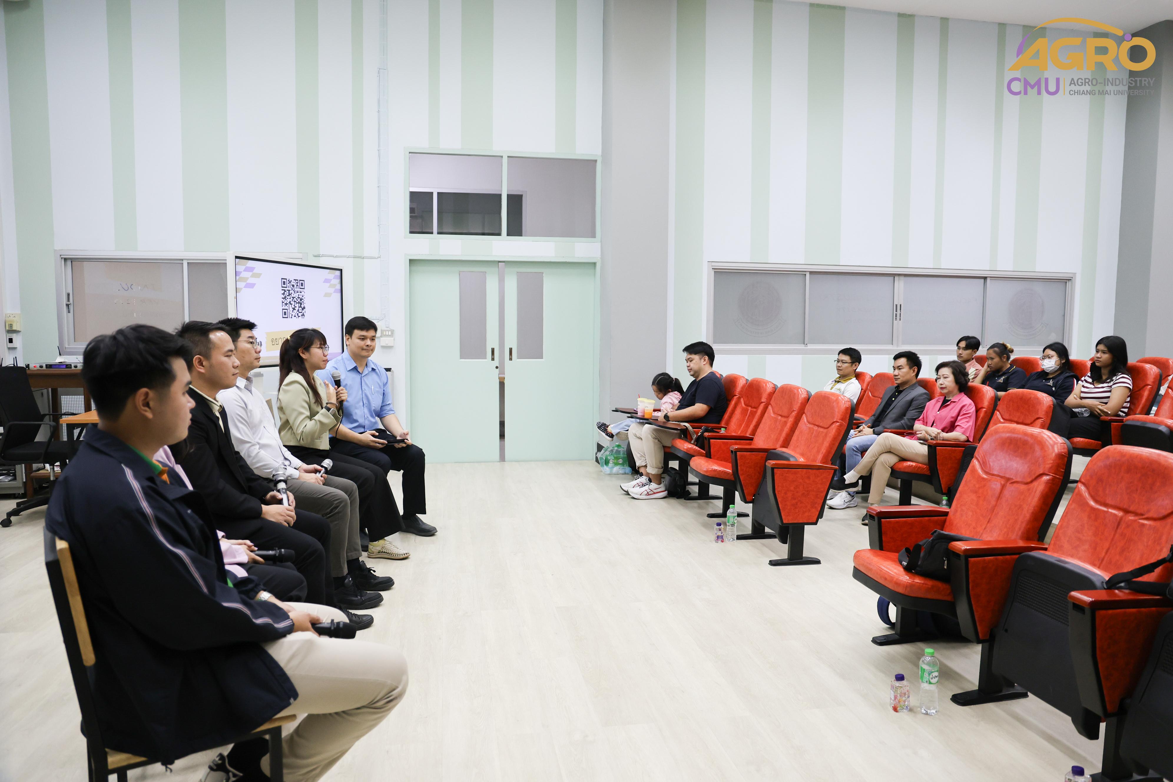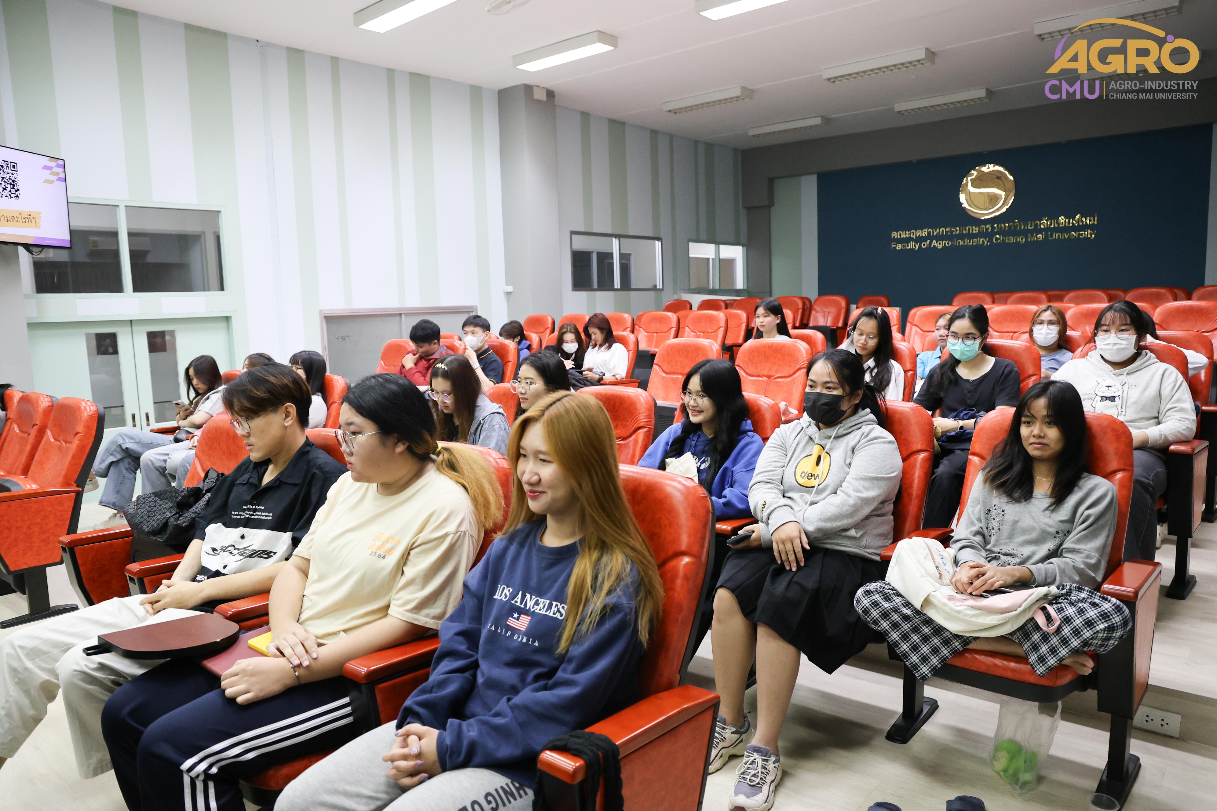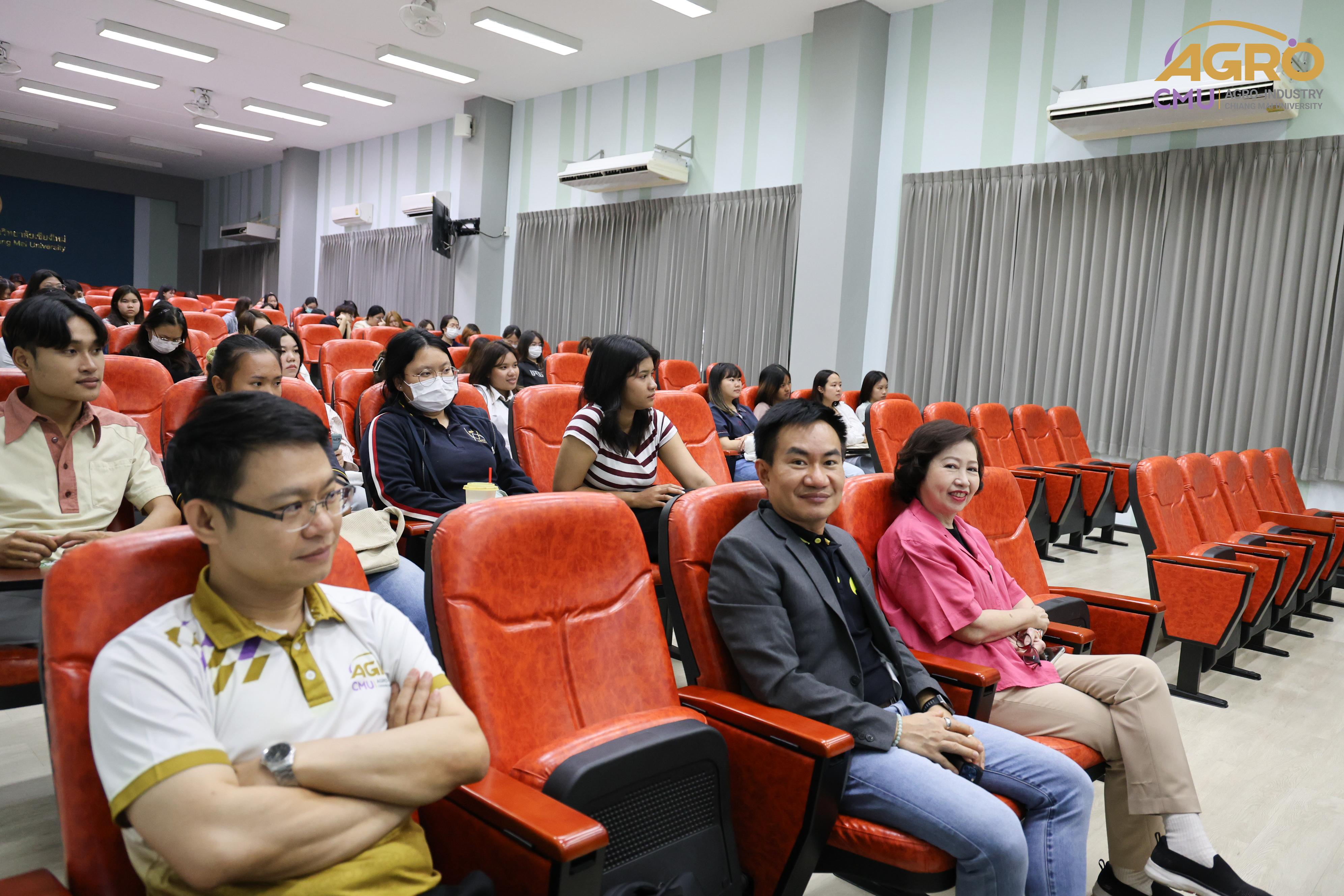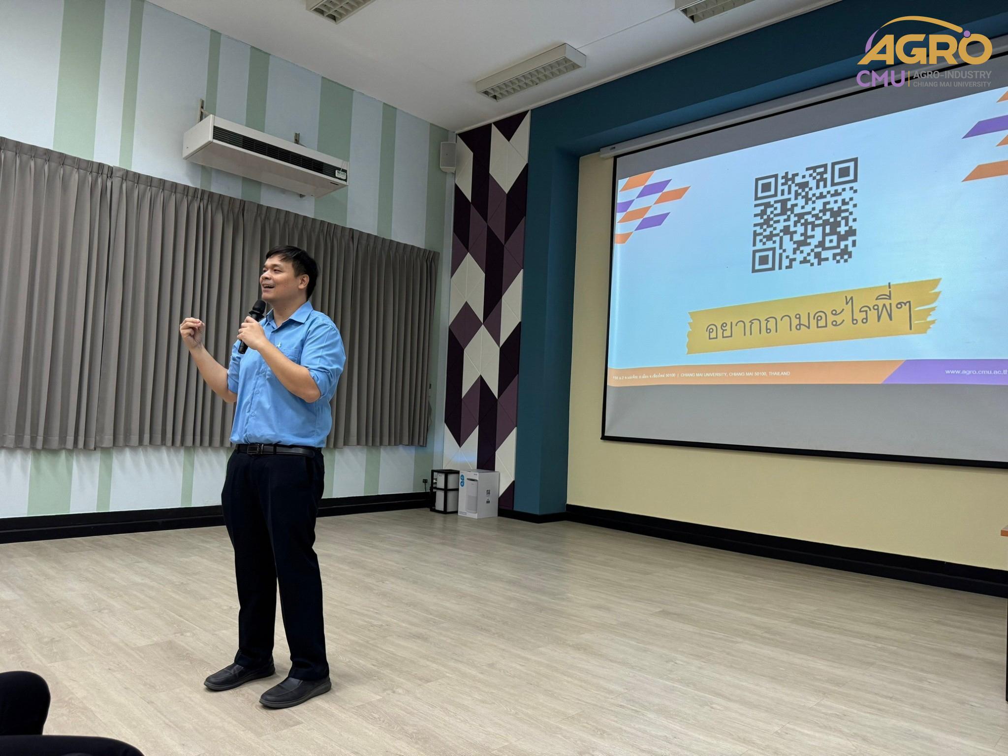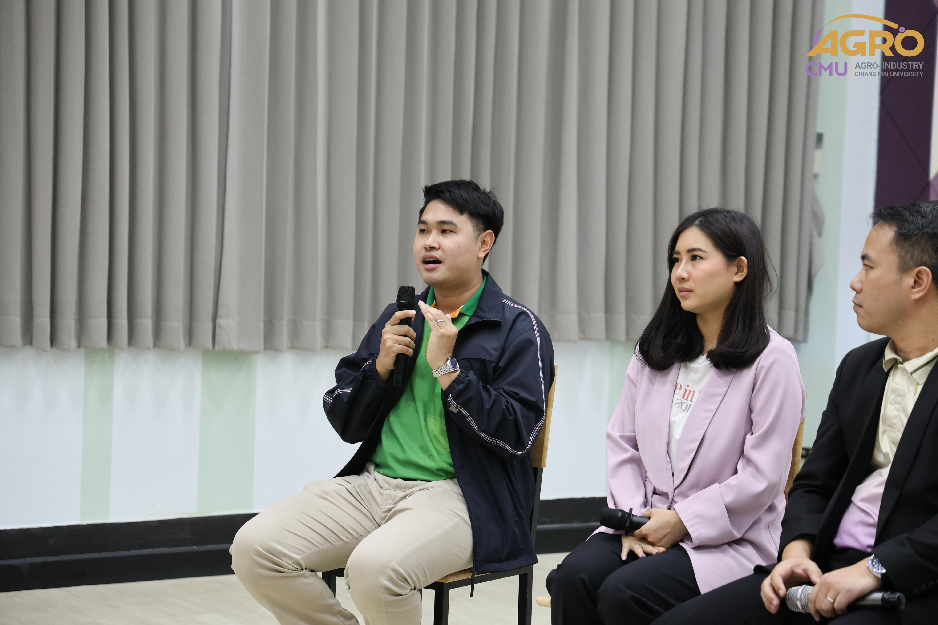 เมื่อวันที่ 19 กุมภาพันธ์ 2567 ที่ผ่านมา สำนักวิชาอุตสาหกรรมเกษตร ได้จัดกิจกรรม “AGRO TALK 2024” เพื่อให้นักศึกษาได้เห็นถึงแนวทางการประกอบอาชีพในอนาคต การเตรียมความพร้อมก่อนเข้าสู่วิชาชีพ และเสริมสร้างความสัมพันธ์อันดีระหว่าง ศิษย์ปัจจุบัน ศิษย์เก่า และบุคลากรของคณะฯ โดยในกิจกรรมนี้ได้รับเกียรติจากรุ่นพี่ศิษย์เก่าหลากหลายสาขาอาชีพในการเป็นวิทยากรและเข้าร่วมการเสวนา จำนวน 5 ท่าน ได้แก่ 1) พี่ต้น (เฉลิมพล ใหม่คำ) ผู้จัดการโรงงานแปรรูปเนื้อไก่ ลำปาง บริษัท ซีพีเอฟ (ประเทศไทย) จำกัด (มหาชน) 2) พี่โต้ (ยุทธพงษ์ เรืองสิริ) รองกรรมการผู้จัดการบริษัท เชียงใหม่ เฮลตี้ โปรดักส์ จำกัด 3) พี่แนน (เบญญาภา ภิญโญฤทธิ์) Medical Representative (บริษัท ลอรีอัล ประเทศไทย จำกัด) 4) พี่เฟิร์น (ธันย์ชนก ยอเสน) นักวิทยาศาสตร์ ห้องปฏิบัติการกลาง คณะเกษตรศาสตร์ มหาวิทยาลัยเชียงใหม่ และ 5) พี่โดนัท (ณัชพล อยู่เย็น) นักวิชาการส่งเสริมการเกษตรปฏิบัติการ สำนักงานเกษตรจังหวัดเชียงใหม่