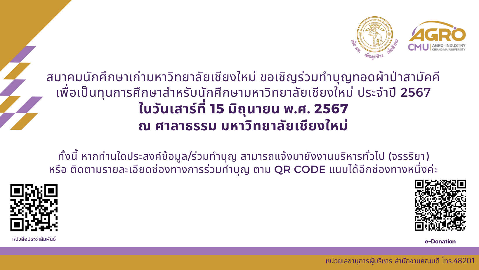 ขอเชิญร่วมทำบุญทอดผ้าป่าสามัคคีเพื่อเป็นทุนการศึกษาแก่นักศึกษามหาวิทยาลัยเชียงใหม่ ประจำปี 2567