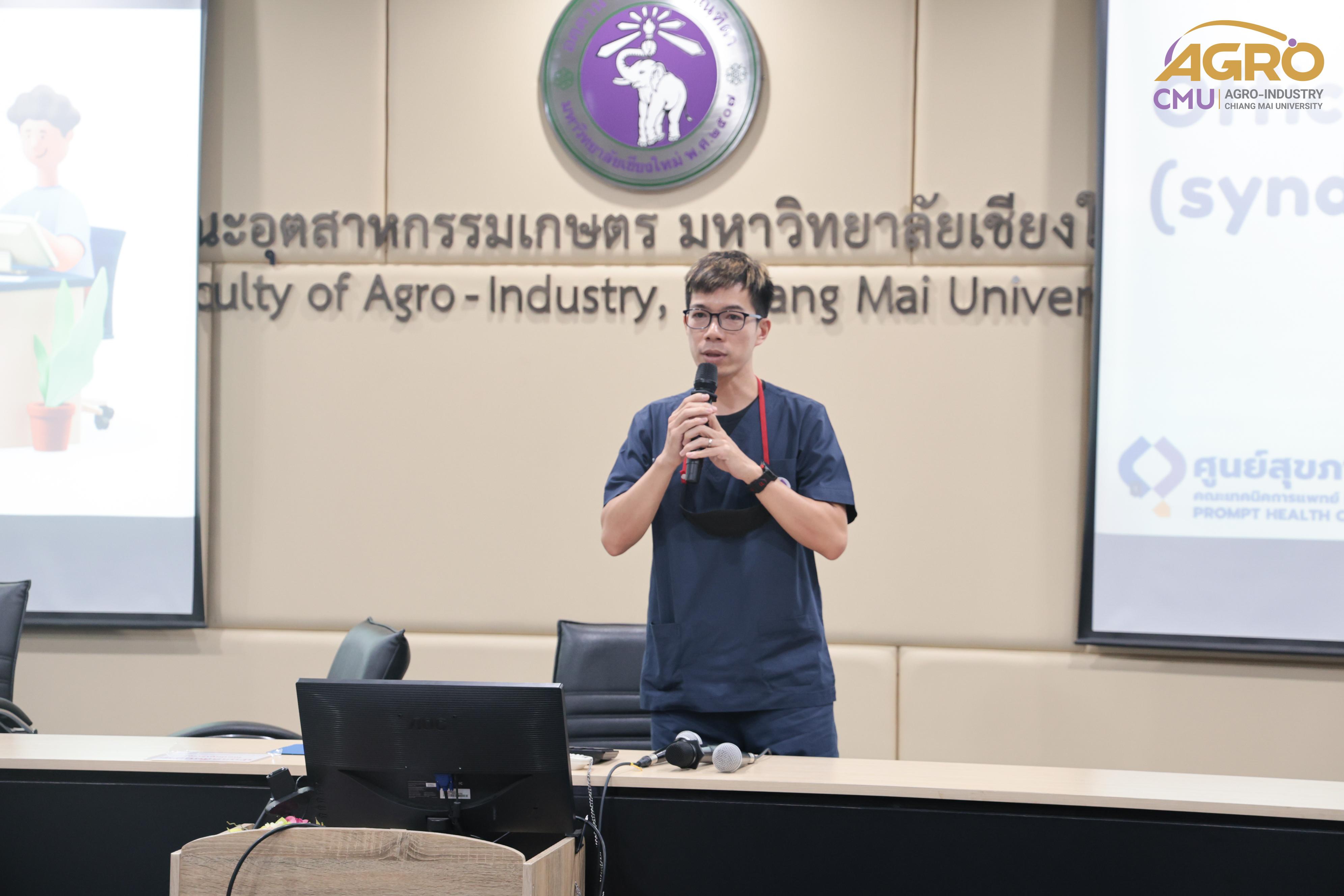 เมื่อวันพฤหัสบดีที่ 23 พฤษภาคม 2567 คณะอุตสาหกรรมเกษตร มหาวิทยาลัยเชียงใหม่ ได้จัดกิจกรรม office syndrome ภัยเงียบคนทำงาน เพื่อเสริมสร้างความรู้ ความเข้าใจให้แก่บุคลากรเกี่ยวกับโรค office syndrome โดยมีศูนย์สุขภาพพร้อม คณะเทคนิคการแพทย์ มหาวิทยาลัยเชียงใหม่ เป็นวิทยากร ซึ่งมีผู้บริหารและบุคลากรเข้าร่วมอบรม ณ ห้องประชุม 4
