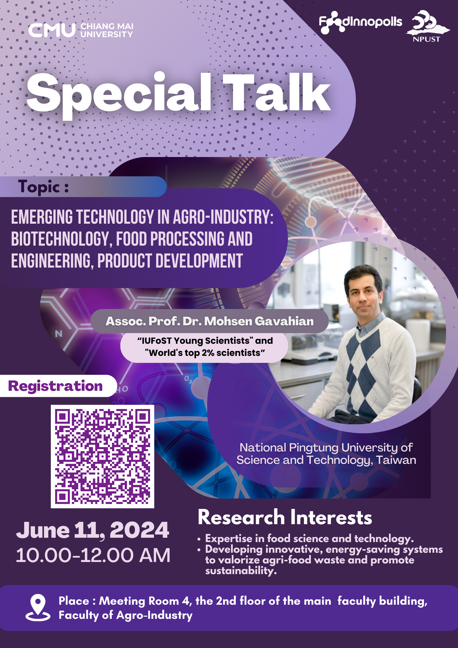 คณะอุตสาหกรรมเกษตร มหาวิทยาลัยเชียงใหม่ ร่วมกับ Food Innopolis จัดการบรรยายพิเศษจาก Assoc.Prof.Dr.Mohsen Gavahian (IUFoST Young Scientists and World's top 2% scientista) จาก National Pingtung University of science and technology, Taiwan