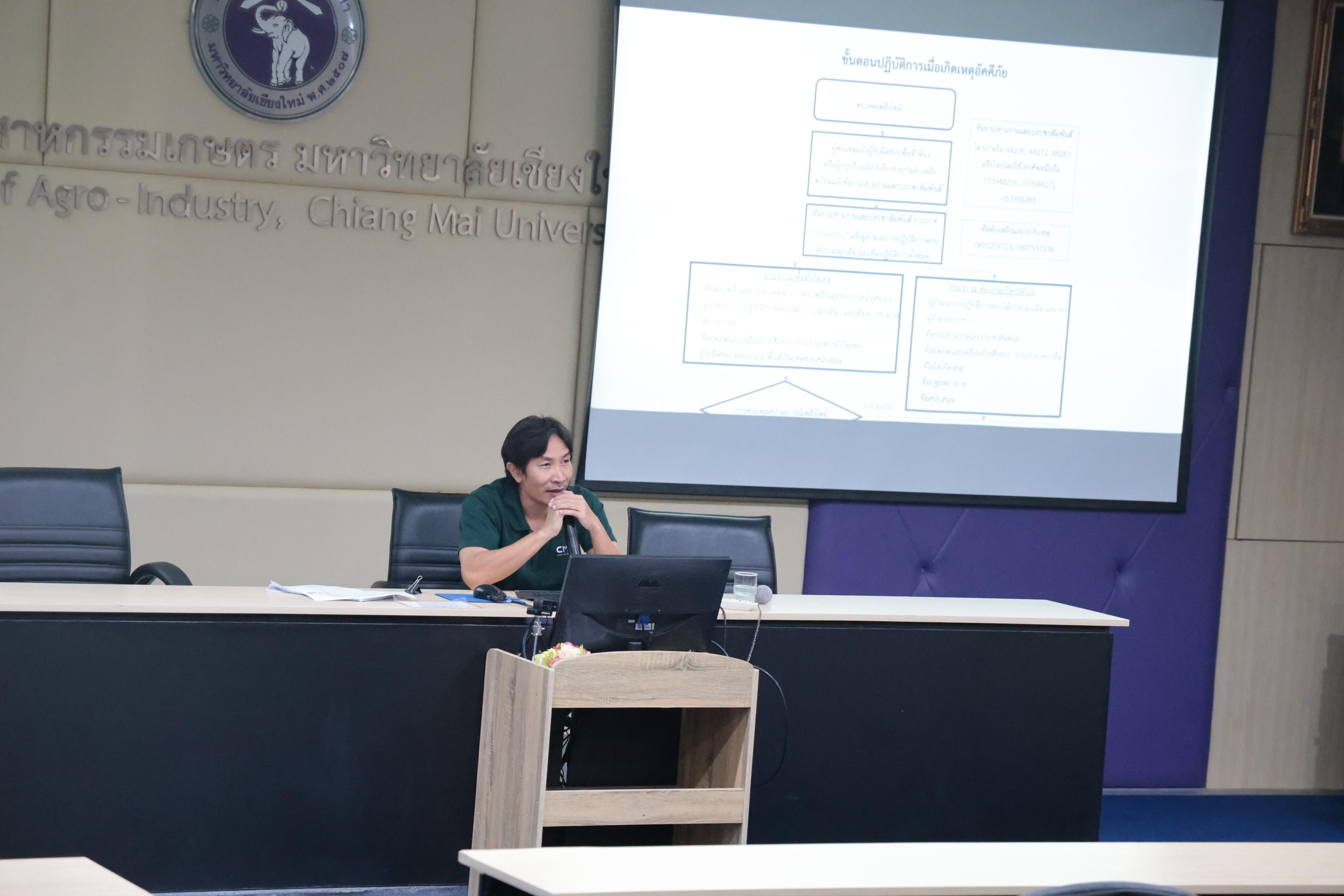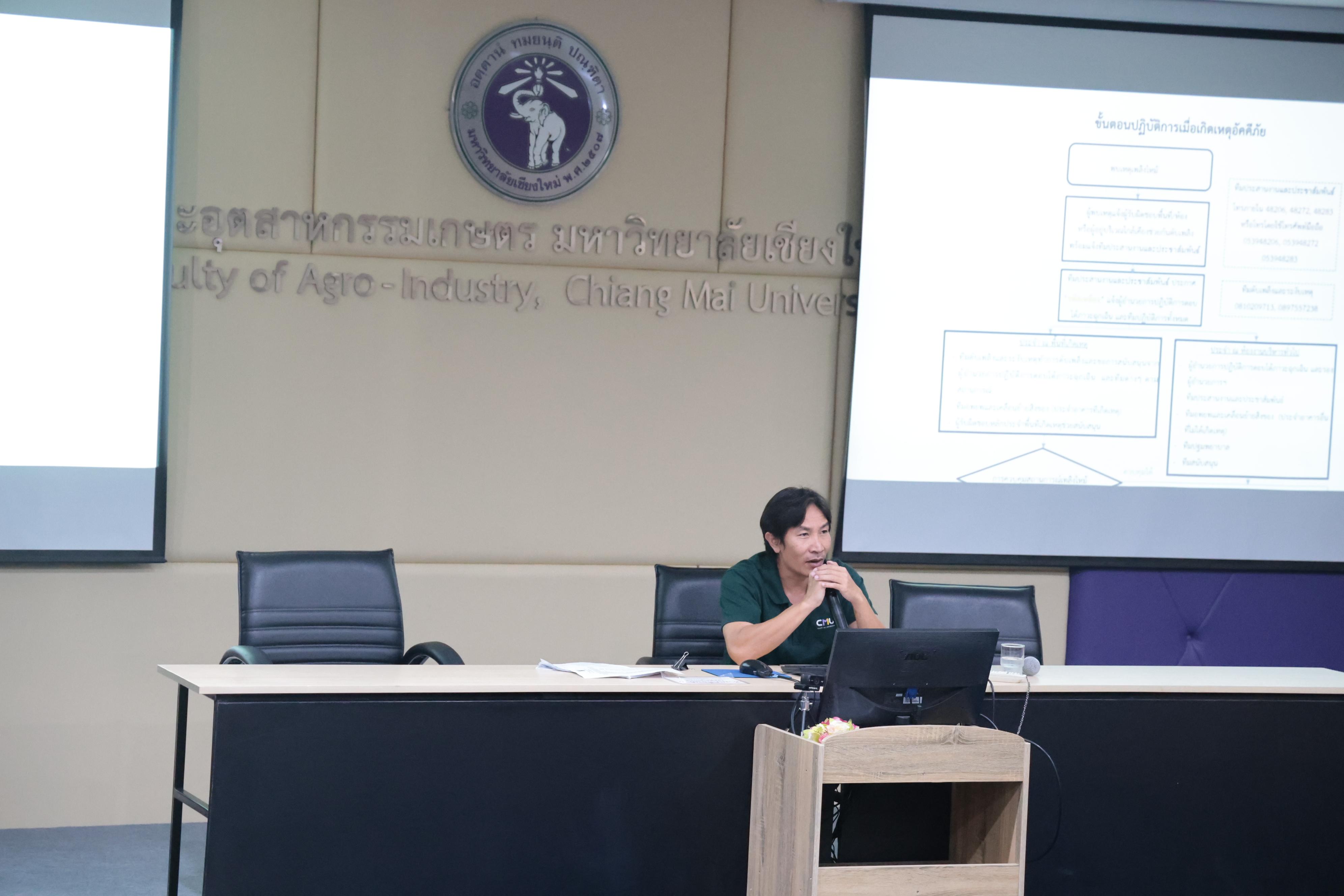 เมื่อวันพฤหัสบดีที่ 30 พฤษภาคม 2567 คณะอุตสาหกรรมเกษตร มหาวิทยาลัยเชียงใหม่ ได้จัดอบรมอบรมชี้แจงเกี่ยวกับการรับมือตอบโต้ในสภาวะฉุกเฉินเบื้องต้น เพื่อเสริมสร้างความรู้ ความเข้าใจเกี่ยวกับการรับมือตอบโต้สภาวะฉุกเฉินให้แก่บุคลากร โดยมีนายสุรเชษฐ์ ณ เชียงใหม่ ตำแหน่ง ช่างเทคนิค ชำนาญงานพิเศษ เป็นวิทยากร ซึ่งมีผู้บริหารและบุคลากรเข้าร่วมอบรม ณ ห้องประชุม 4
