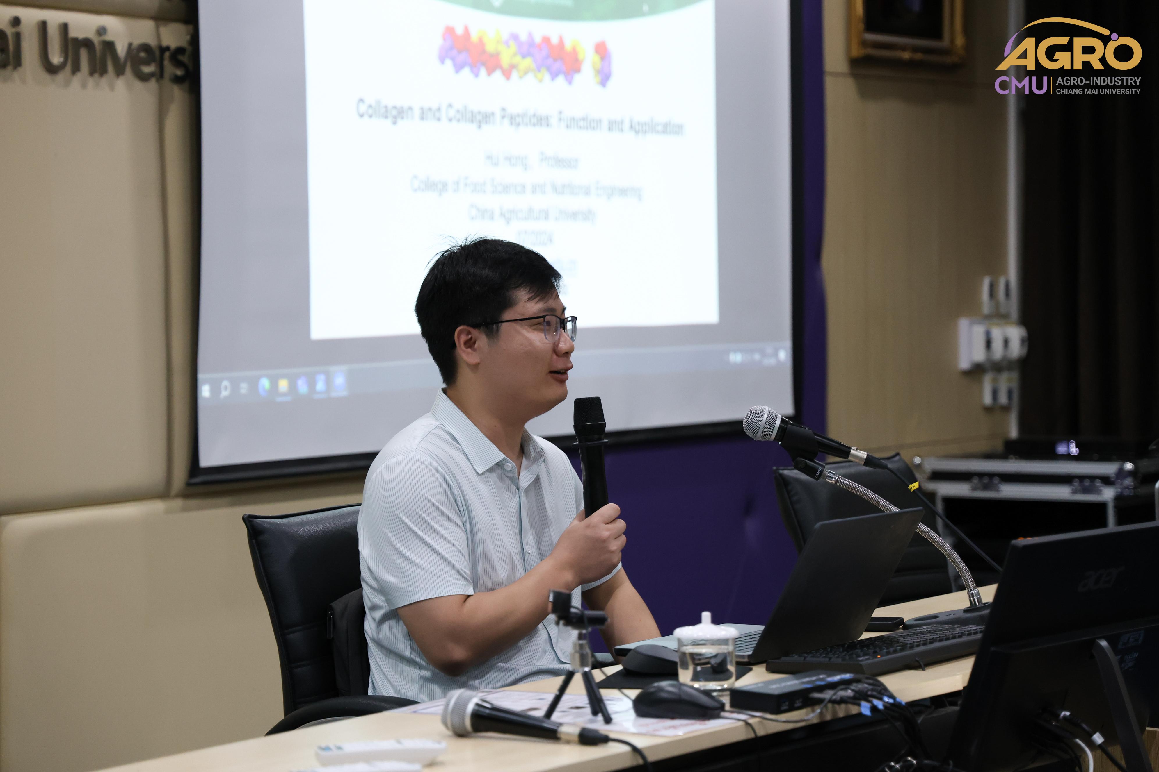 On Thursday, July 18, 2024, Associate Professor Dr. Yuttana Phimolsiripol, Dean of the Faculty of Agro-Industry, along with the faculty's administration and staff, welcomed Prof. Dr. Hui Hong from China Agricultural University. The purpose of the visit was to discuss academic collaborations and exchange programs. Additionally, a special lecture on the topic "Collagen and Collagen Peptides: Function and Application" was presented. The event took place in Meeting Room 3 of the Faculty of Agro-Industry building. Following the discussions, the guests toured the Food Innovation and Packaging Center (FIN), the pilot plant, and the laboratories of the Faculty of Agro-Industry.