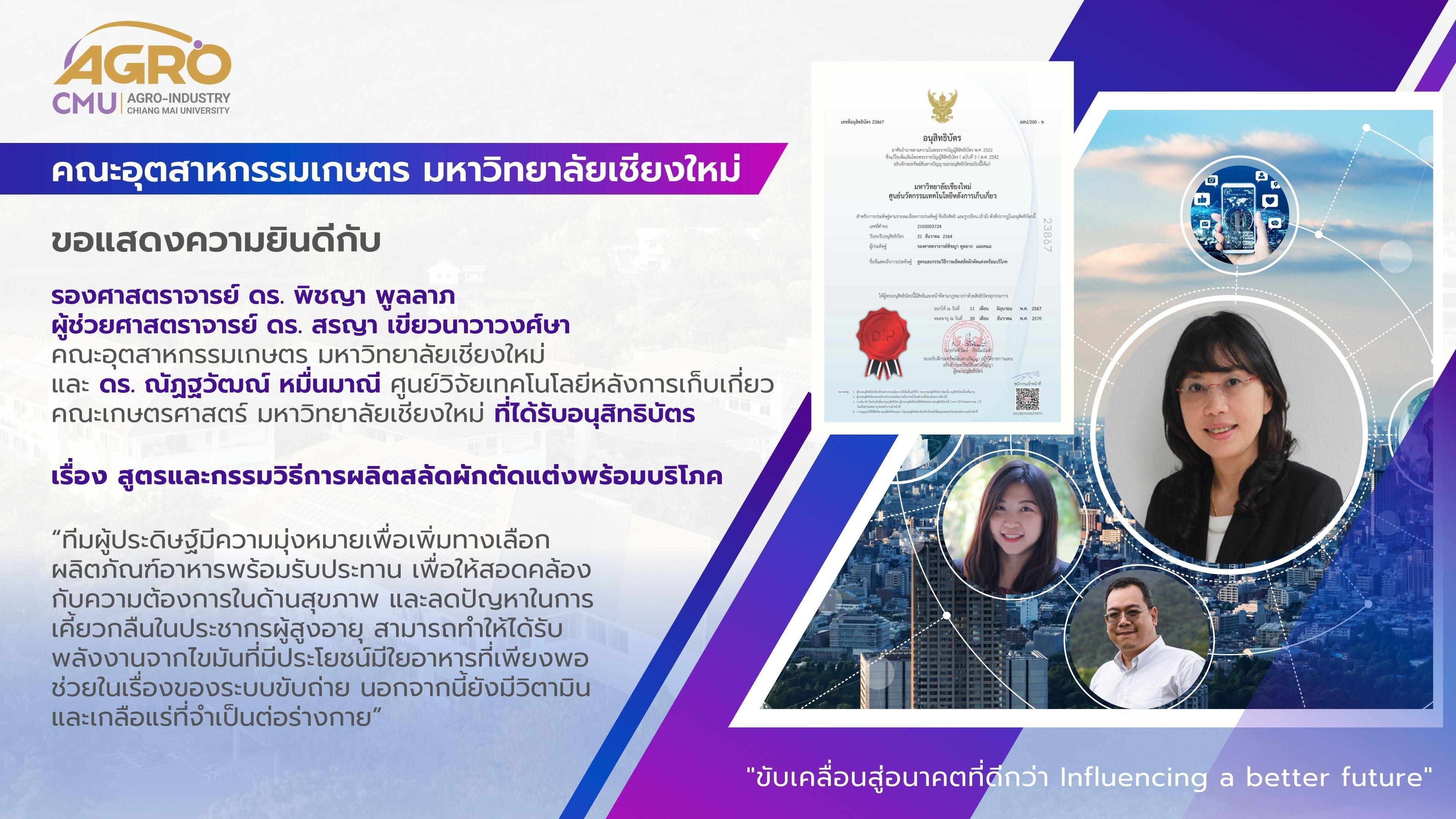 คณะอุตสาหกรรมเกษตร มหาวิทยาลัยเชียงใหม่ ขอแสดงความยินดีกับ รองศาสตราจารย์ ดร. พิชญา พูลลาภ, ผู้ช่วยศาสตราจารย์ ดร. สรญา เขียวนาวาวงศ์ษา คณะอุตสาหกรรมเกษตร มหาวิทยาลัยเชียงใหม่ และ ดร. ณัฏฐวัฒณ์ หมื่นมาณี ศูนย์วิจัยเทคโนโลยีหลังการเก็บเกี่ยว คณะเกษตรศาสตร์ มหาวิทยาลัยเชียงใหม่ ที่ได้รับอนุสิทธิบัตร เรื่อง สูตรและกรรมวิธีการผลิตสลัดผักตัดแต่งพร้อมบริโภค “ทีมผู้ประดิษฐ์ มีความมุ่งหมายเพื่อเพิ่มทางเลือกผลิตภัณฑ์อาหารพร้อมรับประทาน เพื่อให้สอดคล้องกับความต้องการในด้านสุขภาพ และลดปัญหาในการเคี้ยวกลืนในประชากรผู้สูงอายุ สามารถทําให้ได้รับพลังงานจากไขมันที่มีประโยชน์มีใยอาหารที่เพียงพอช่วยในเรื่องของระบบขับถ่าย นอกจากนี้ยังมีวิตามินและเกลือแร่ที่จําเป็นต่อร่างกาย”