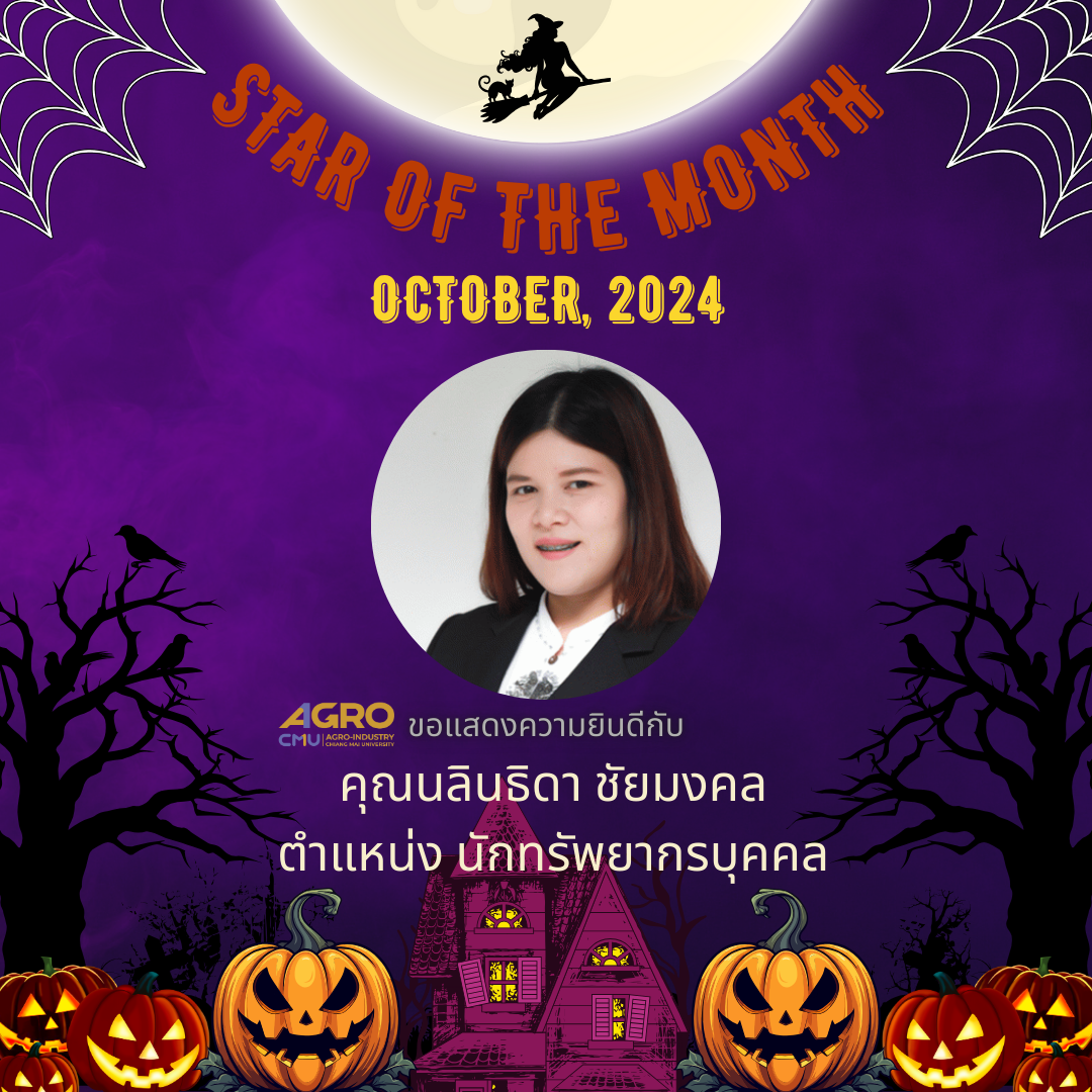 Faculty of Agro-Industry, Chiang Mai University would like to congratulate Mrs. Nalintida Chaimongkol, Human Resource Officer, and Mr. Naphat Chueaboonmee, Research Executive Officer, who were voted STAR OF THE MONTH for October 2024. The STAR OF THE MONTH activity was created to encourage workers with outstanding performance. The voting results come from executives and employees of the organization.