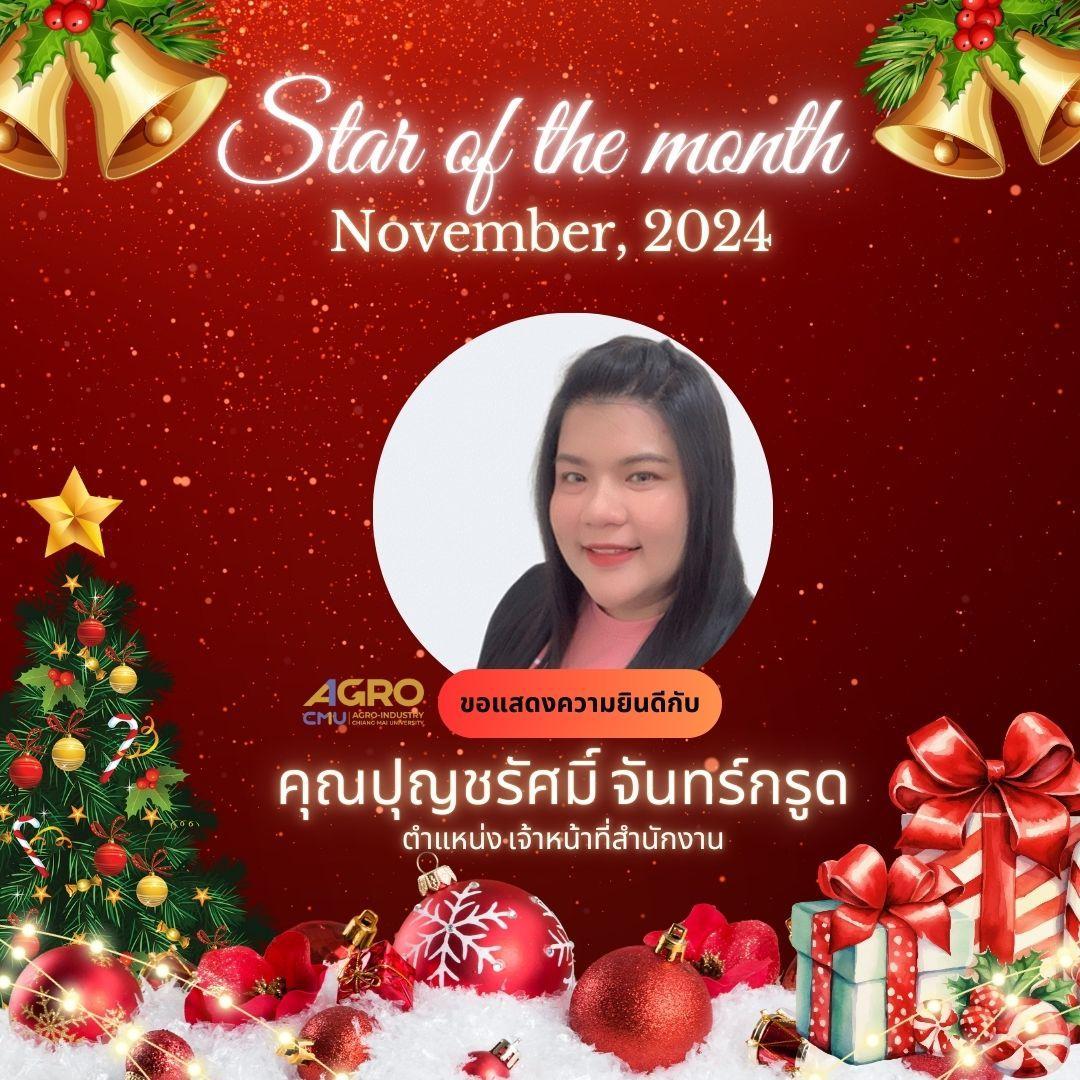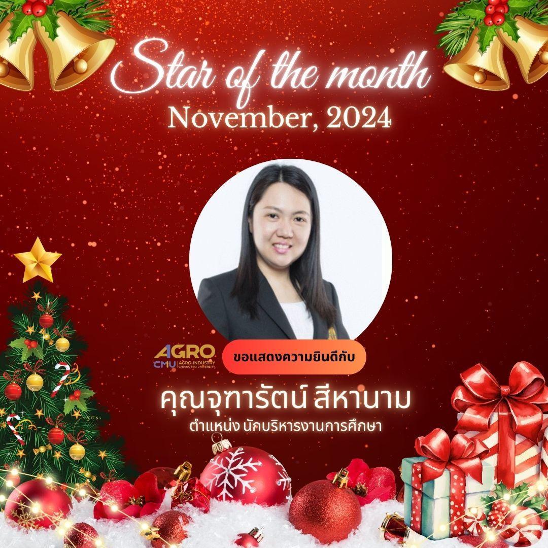คณะอุตสาหกรรมเกษตร มหาวิทยาลัยเชียงใหม่ ขอแสดงความยินดีกับ นางจุฑารัตน์ สีหานาม ตำแหน่ง นักบริหารงานการศึกษา และ นางสาวปุญชรัศมิ์ จันทร์กรูด ตำแหน่ง เจ้าหน้าที่สำนักงาน ที่ด้รับการโหวตให้เป็น STAR OF THE MONTH ประจำเดือน พฤศจิกายน 2567 กิจกรรม STAR OF THE MONTH ได้จัดทำขึ้นเพื่อเป็นกำลังใจให้กับผู้ปฏิบัติงานที่มีผลงานและพฤติกรรมดีเด่นในแต่ละเดือน โดยผลการโหวตจะมาจากผู้บริหารและพนักงานทั้งองค์กร