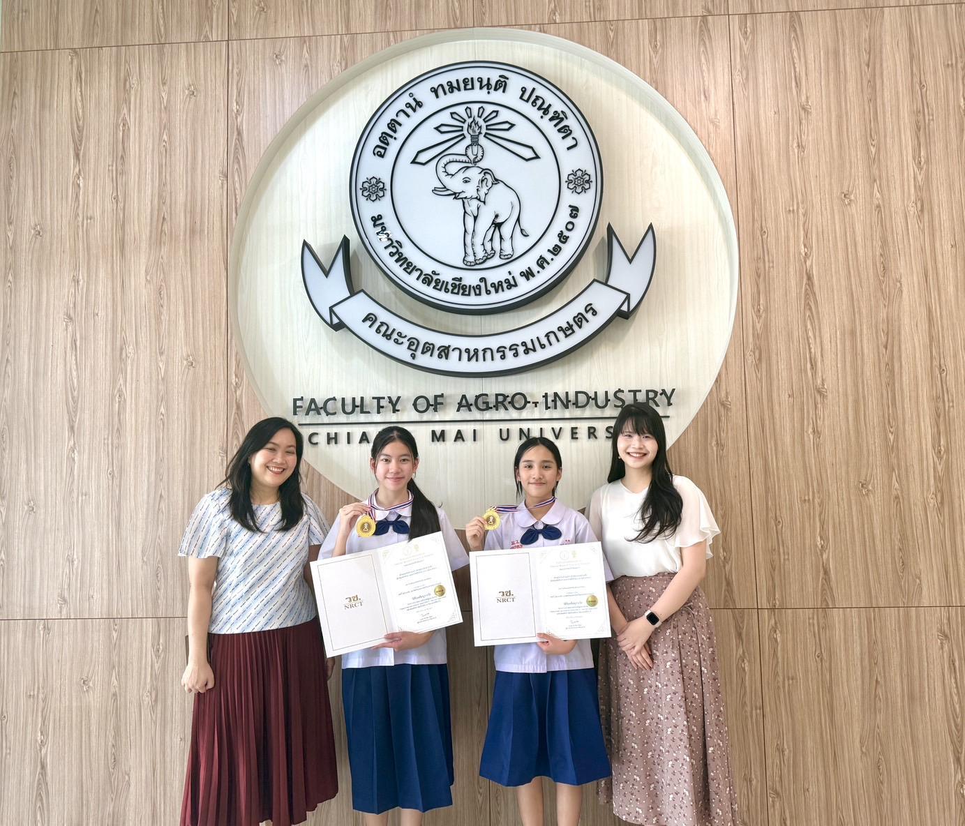 The Faculty of Agro-Industry, Chiang Mai University, extends its congratulations to Miss Darin Unchakorn, Miss Premin Aseang, and Miss Mingxi Zhang, Grade 8 students, along with their advisor, Mrs. Warunee Na Lampang, from Montfort College. They presented their project titled "Scoby Wounds Digital: Wound Dressing from Scoby and Moringa Leaf Extract" and won a gold medal in the Thailand I New Generator Awards 2025 (I-New Gen Award 2025) in the high school category for Energy, Materials, and Biochemistry. This achievement was showcased on the Pitching Stage at the "Inventor's Day" event held from February 2-6, 2025, at Event Hall 100-102, BITEC, Bangna, Bangkok. The event was organized by the National Research Council of Thailand (NRCT), Research and Innovation Promotion Division, in collaboration with educational institutions under an MOU. Dr. Niphawan Panti from the Faculty of Agro-Industry, Chiang Mai University, served as a co-advisor.