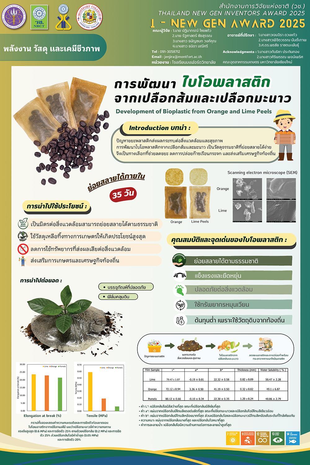 โดยได้รับรางวัลชนะเลิศเหรียญทอง ( I New Gen Award 2025) ในหัวข้อเรื่อง “การพัฒนาไบโอพลาสติกจากเปลือกส้มและเปลือกมะนาว : Development of Bioplastic from Orange and Lime Pells”