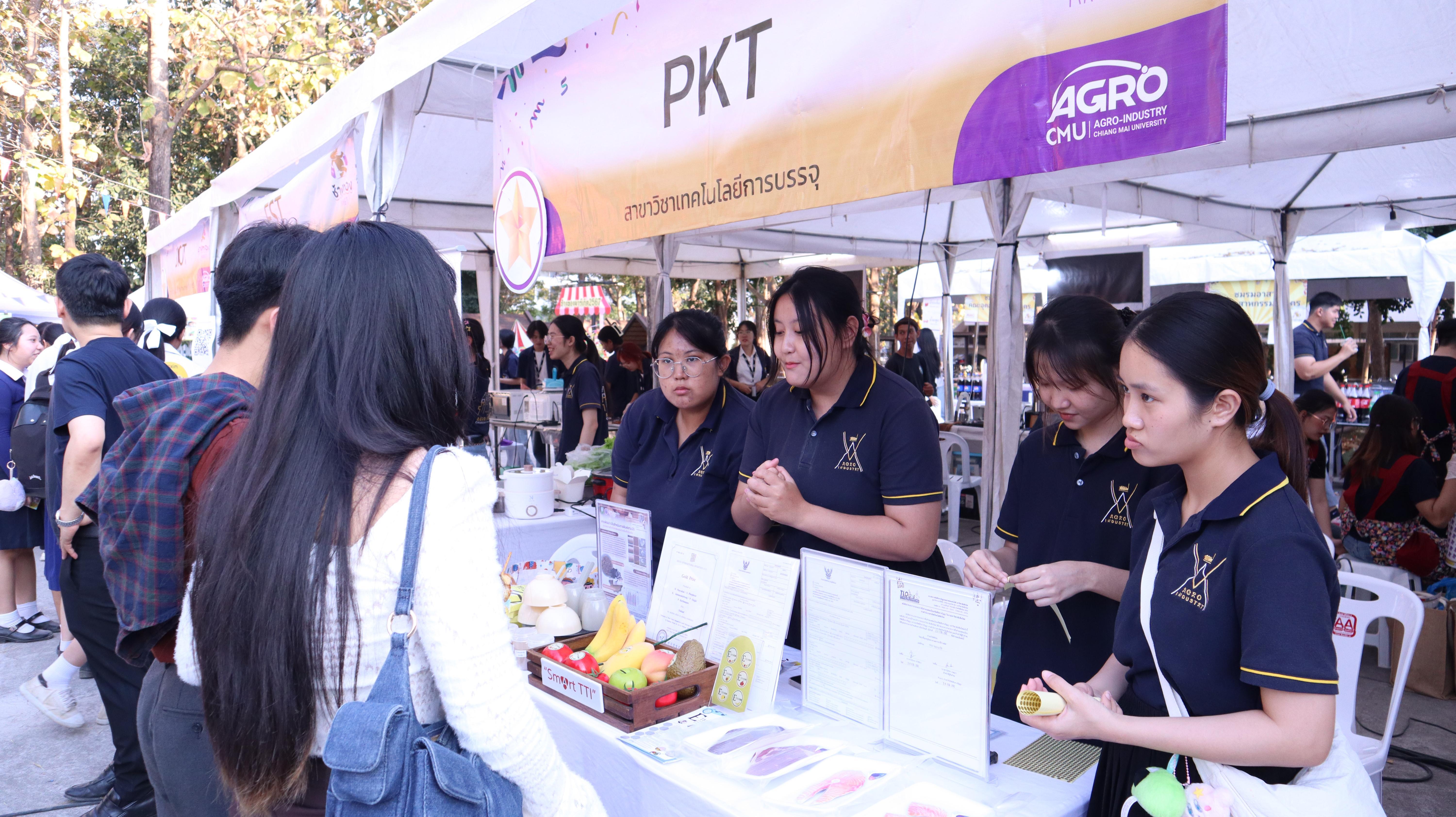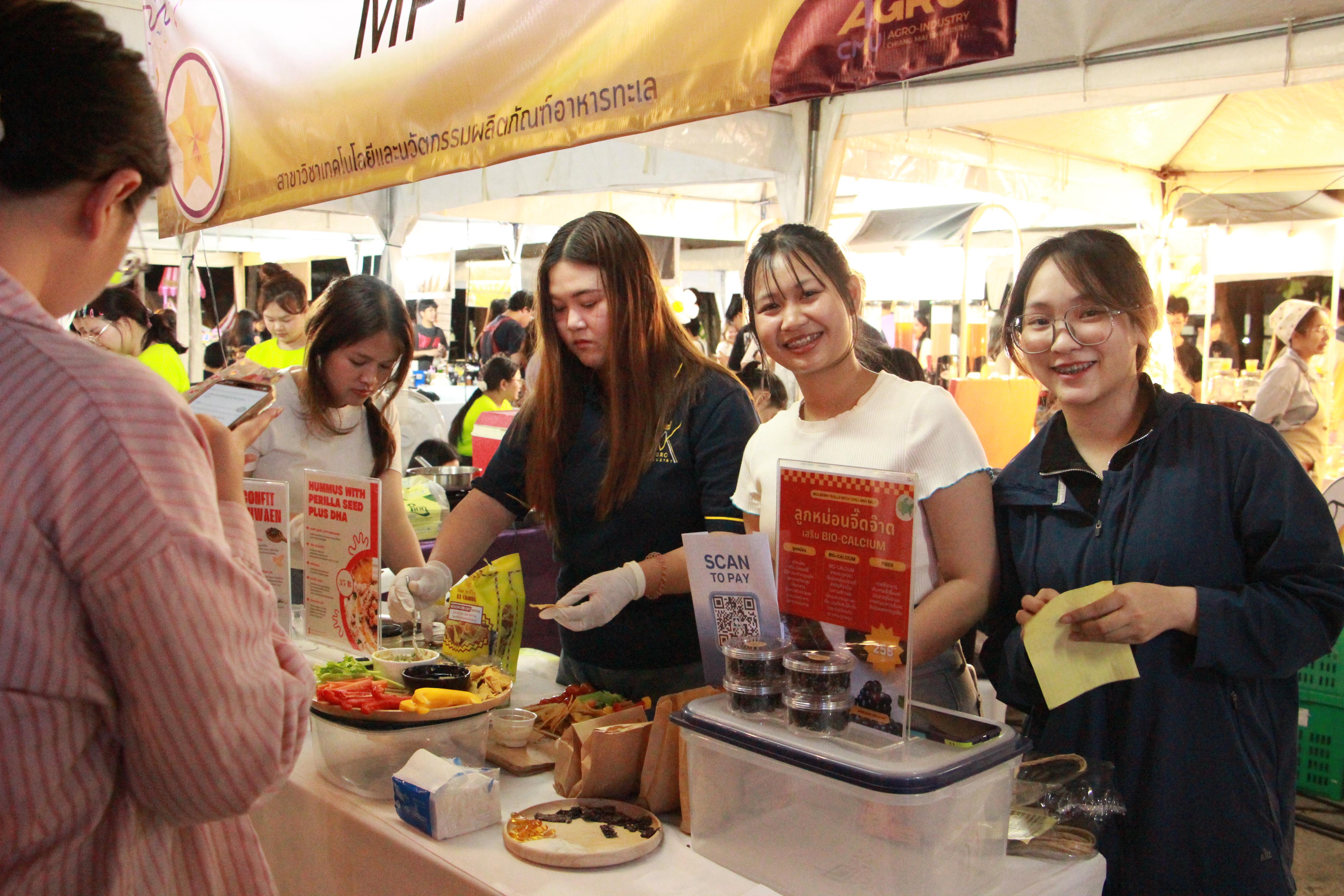 Dr. Thapkrit Khumthup, Assistant Professor responsible for Student Quality Development and Alumni Relations at the Faculty of Agro-Industry, Chiang Mai University, officially opened the event, accompanied by faculty members and a famous Chiang Mai influencer from the "Kongphop Sa Review" page. They toured the student product booths from all six academic departments, as well as booths from alumni and more than 30 external vendors.