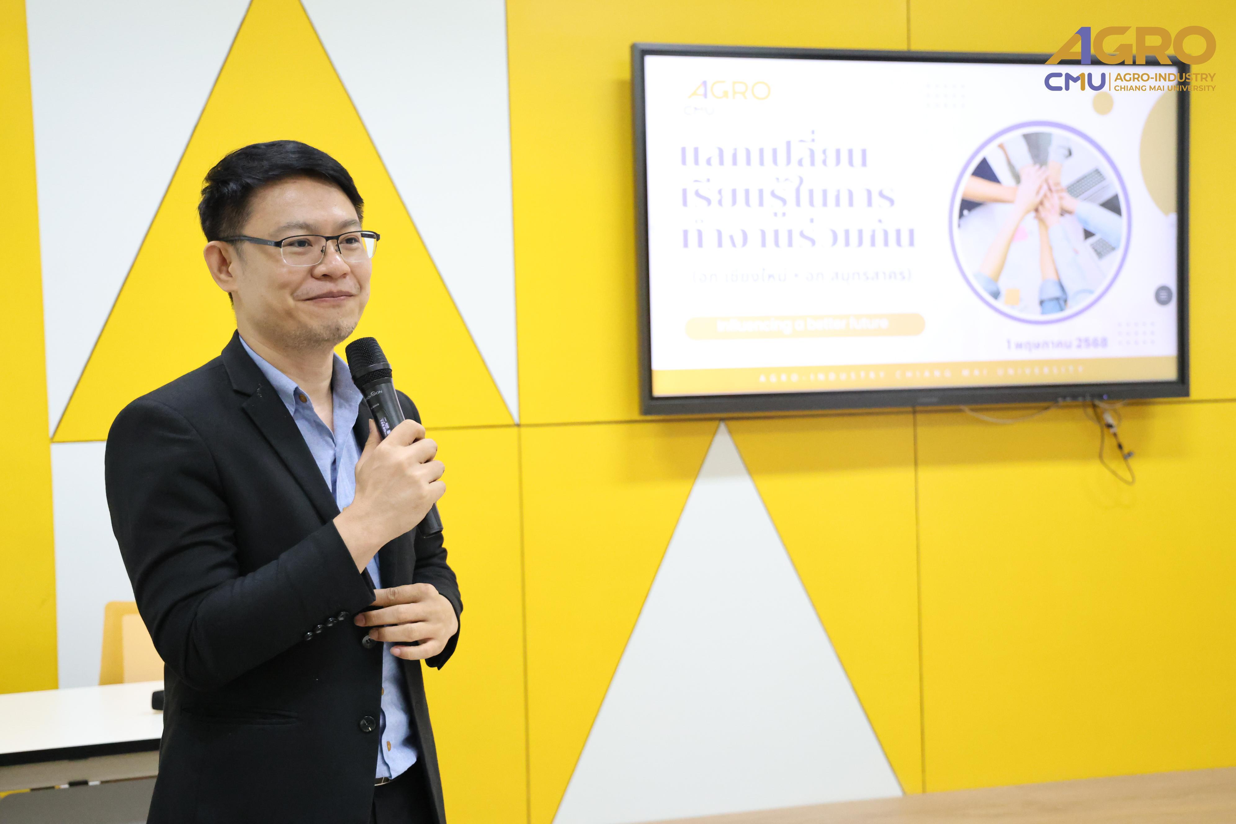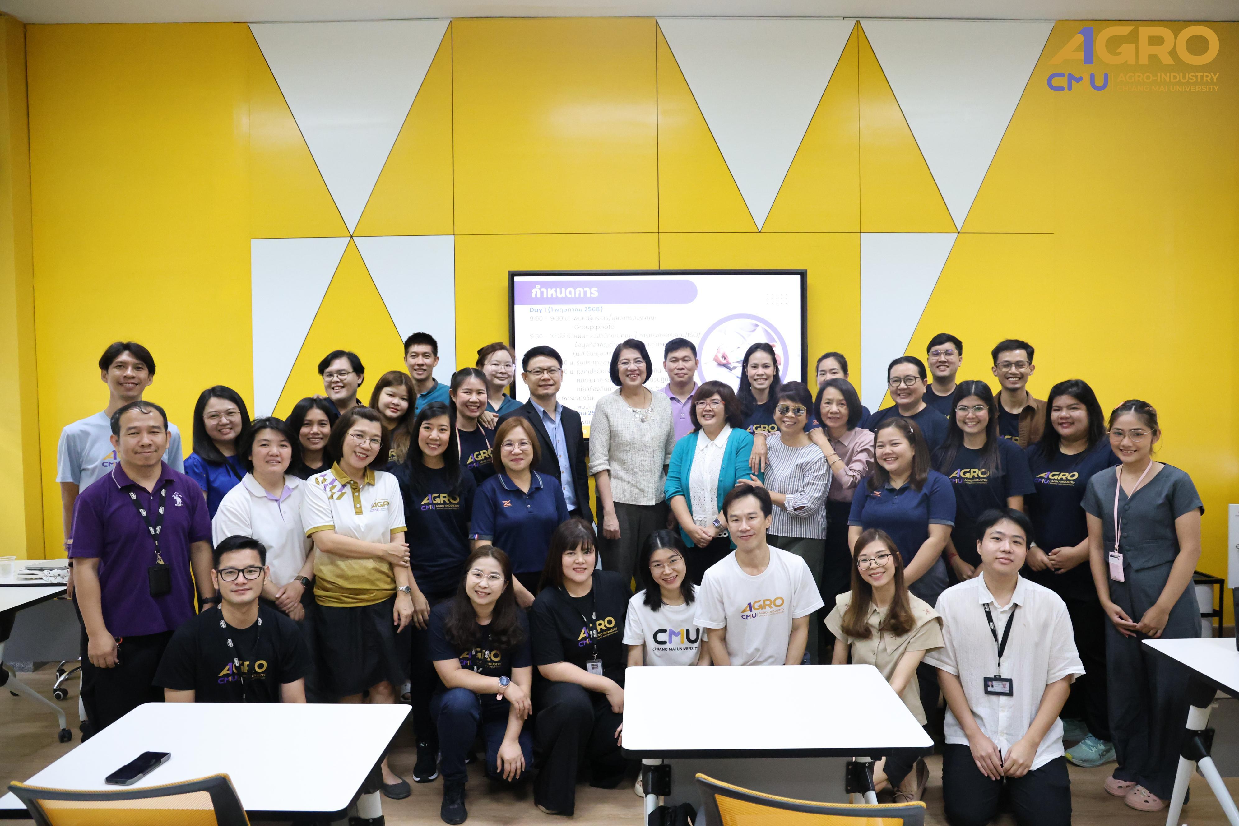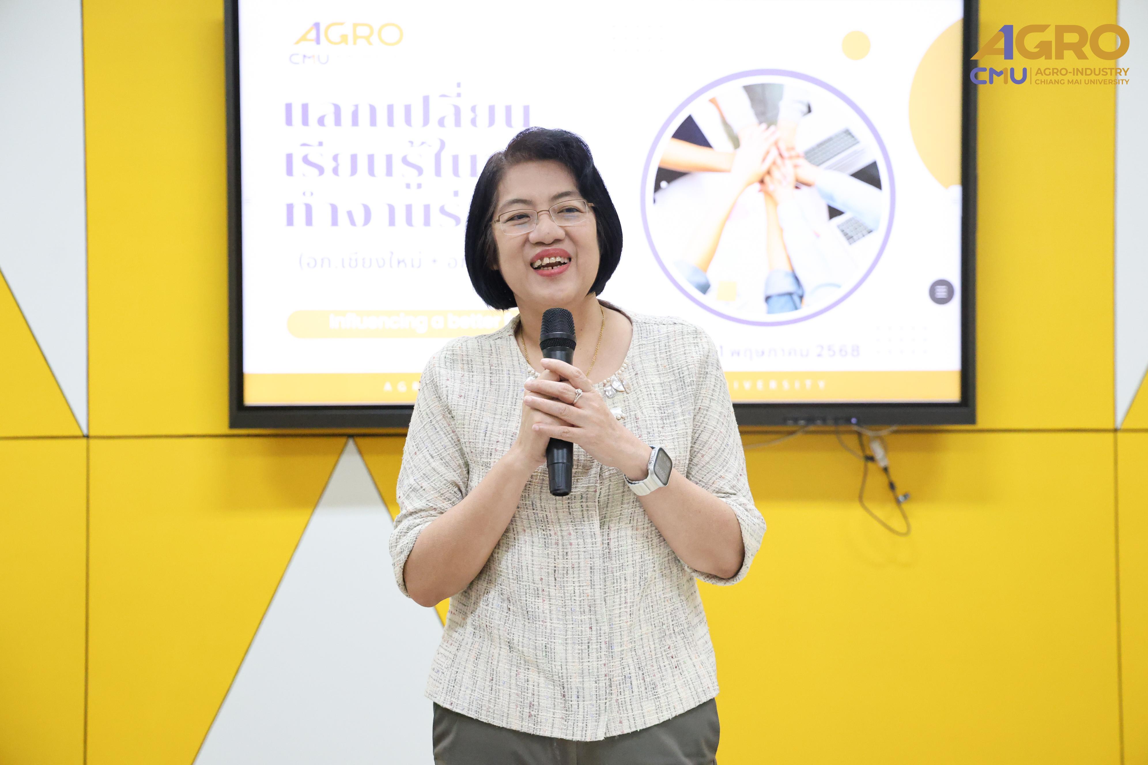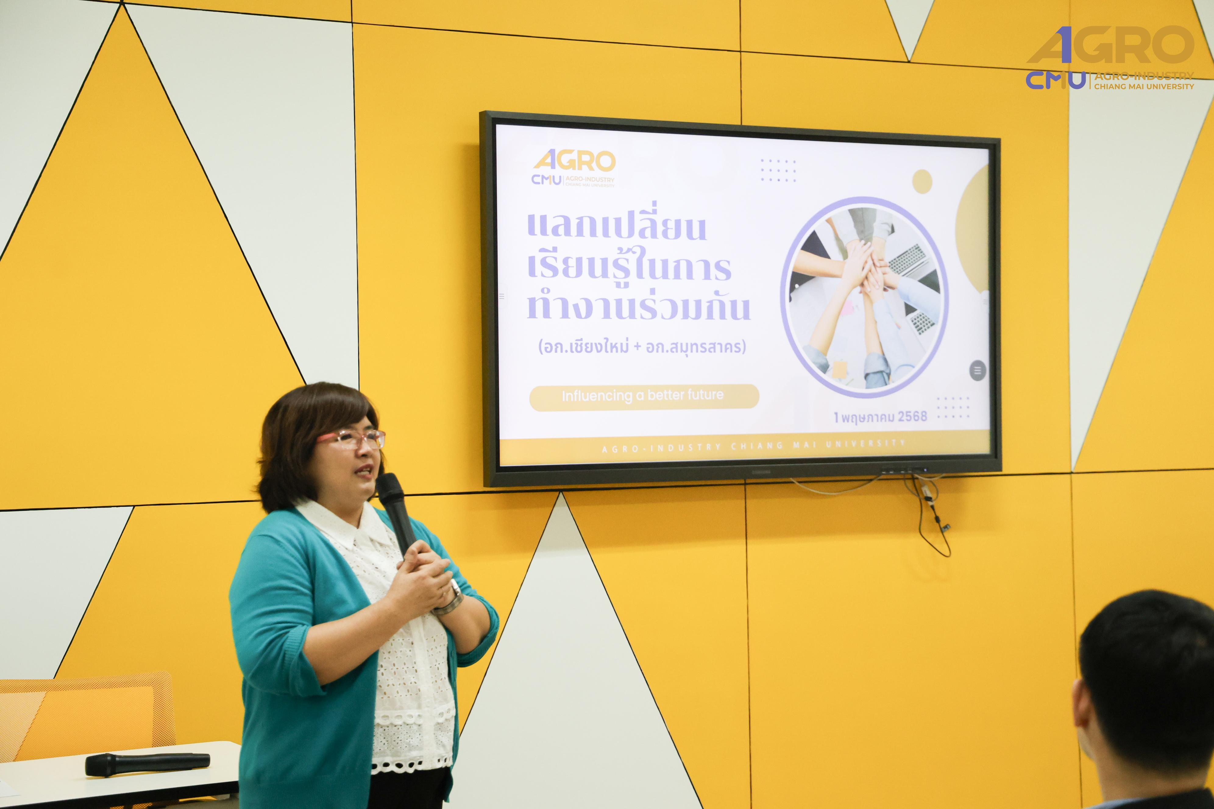 From May 1-2, 2025, the Faculty of Agro-Industry, Chiang Mai University, organized an activity for exchanging work methods among personnel from Chiang Mai and Samut Sakhon. This event involved staff from five departments under the faculty office. Assistant Professor Dr. Srisuwan Naruenartwongsakul, Deputy Dean, presided over the opening ceremony along with Assistant Professor Dr. Suphat Phongthai, Assistant Dean. Additionally, Ms. Piyanuch Sawasdee, Secretary of the Faculty of Agro-Industry, delivered a lecture on filling out General Functional workload forms, performance results according to the faculty office's indicators, and reviewing relevant rules, regulations, announcements, and practices. The event took place in Classroom 1-219, Building 1, 2nd Floor, Faculty of Agro-Industry, Chiang Mai University.