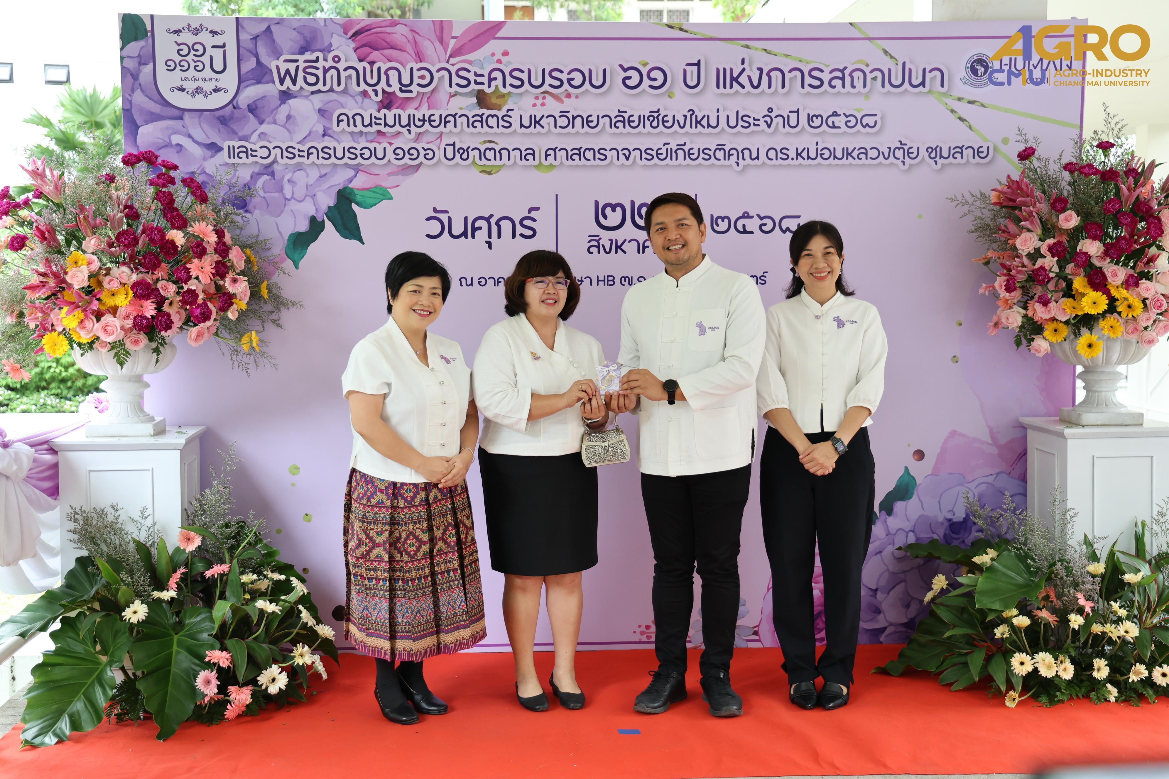 On August 22, 2025, Ms.Piyanuch Sawasdee, Faculty Secretary, joined the merit-making ceremony in celebration of the 61st Anniversary of the Faculty of Humanities, Chiang Mai University. On this occasion, the Faculty of Agro-Industry also contributed a donation to support the Faculty of Humanities Development Fund at the Faculty of Humanities, Chiang Mai University.