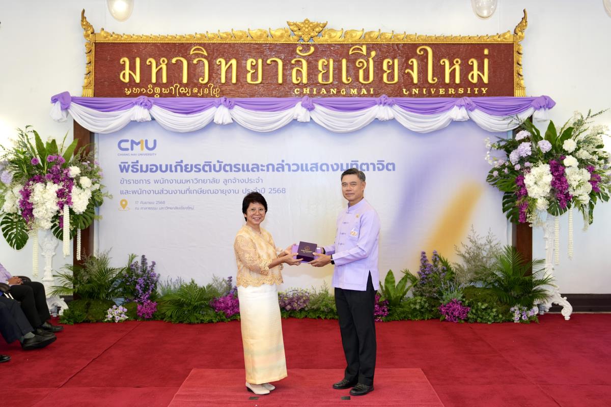 On September 17, 2025, Associate Professor Dr. Sutee Wangtueai, Vice Dean of the Faculty of Agro-Industry, represented the Dean, along with the faculty executives and staff, attended the Farewell and Appreciation Ceremony for retirees of the year 2025. The ceremony was graciously presided over by Professor Dr. Pongruk Sribanditmongkol, President of Chiang Mai University.