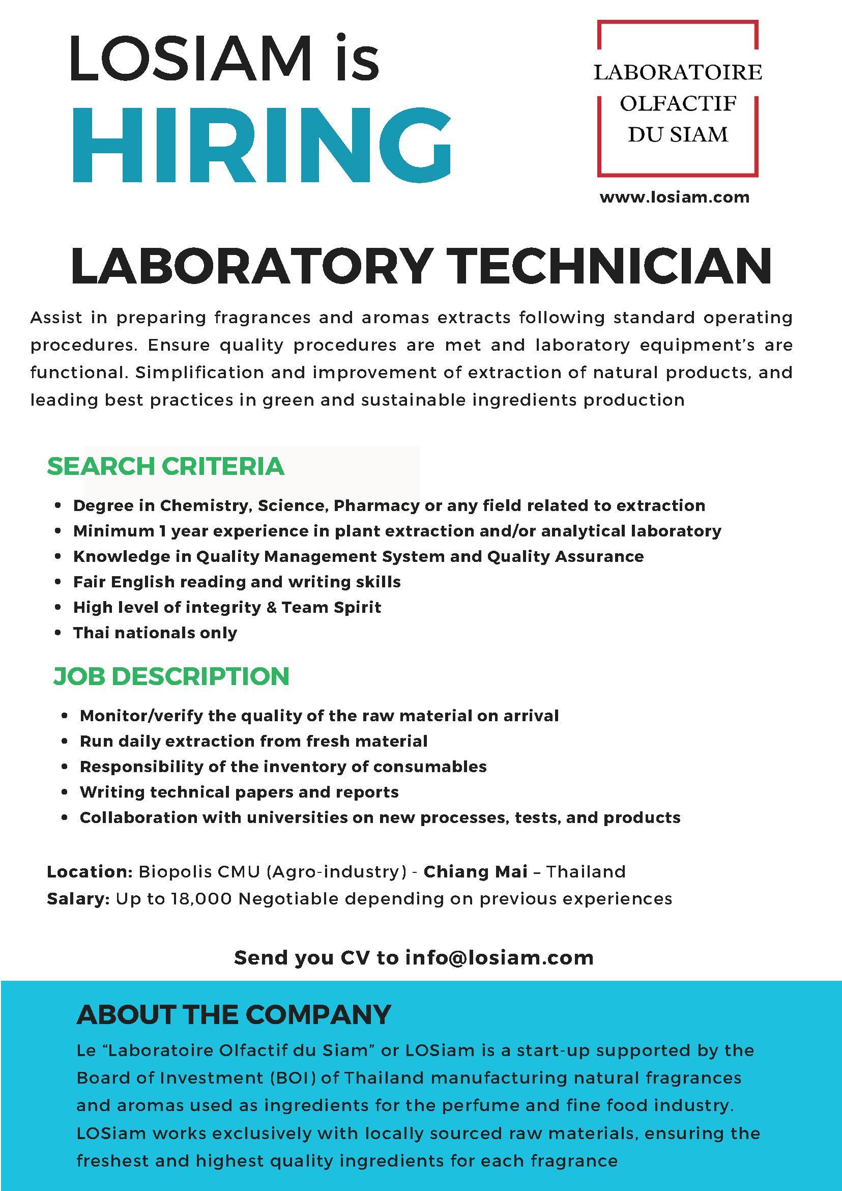 บริษัท แอลโอ สยาม จำกัด เปิดรับสมัครตำแหน่ง นักเทคนิคห้องปฏิบัติการ เพื่อช่วยเหลือในการเตรียมสารสกัดจากน้ำหอมและกลิ่นรสธรรมชาติ